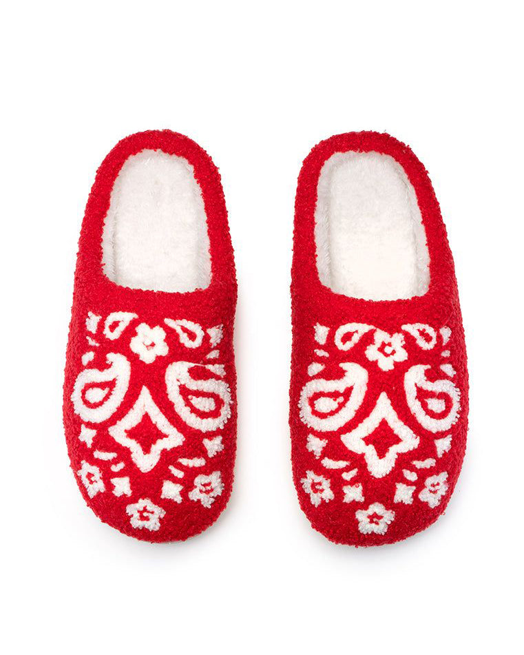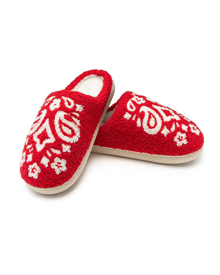 these cozy, super soft slippers come in bold red and feature a western-inspired bandana design. warm slippers have a non-slip rubber bottom, allowing for both indoor and outdoor wear. they make a great gift!