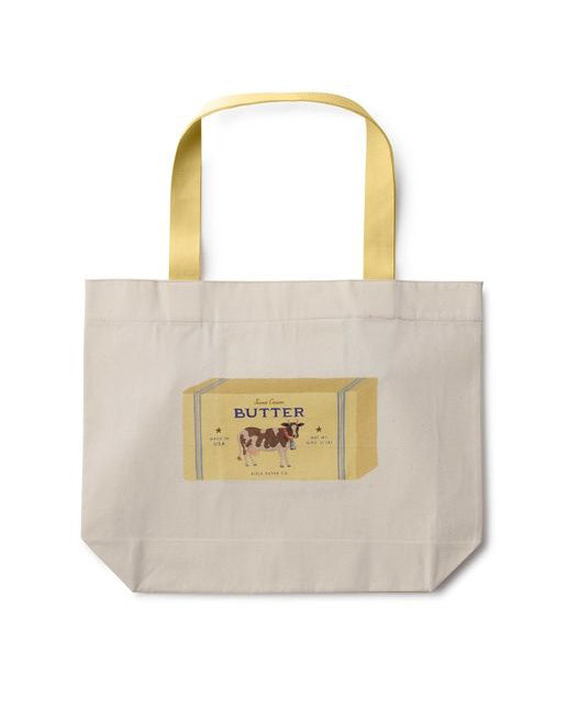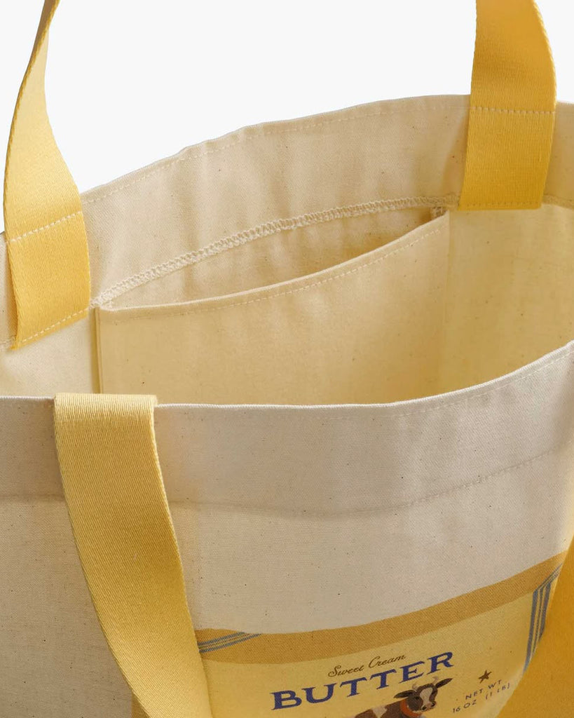 Personify Shopa larger, wider version of rifle paper's classic canvas tote, this illustrated bag is a grab-and-go essential with comfortable woven straps and an interior pocket. bag features a stick of butter graphic and coordinating butter yellow straps.
