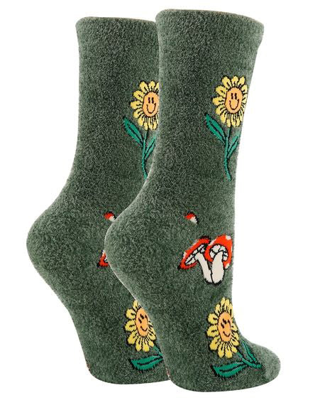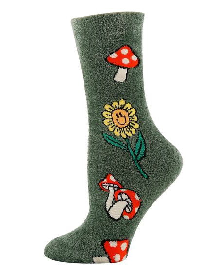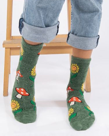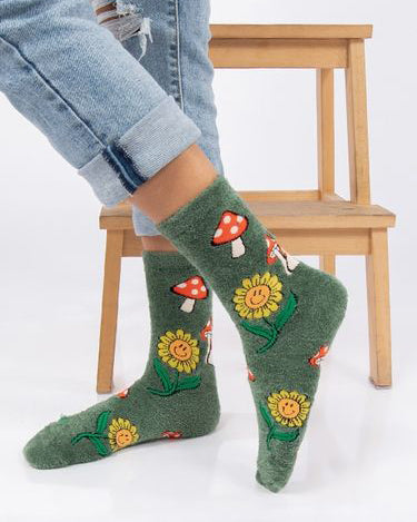 Personify Shopmade with a super soft fluffy material for warmth and comfort, these plush socks are like walking on a cloud. socks are perfect to wear at home while lounging and relaxing. socks come in deep heathered green and have a groovy mushroom design. durable socks feature a fine toe seam to reduce rubbing and provide extra comfort. they make a thoughtful gift!