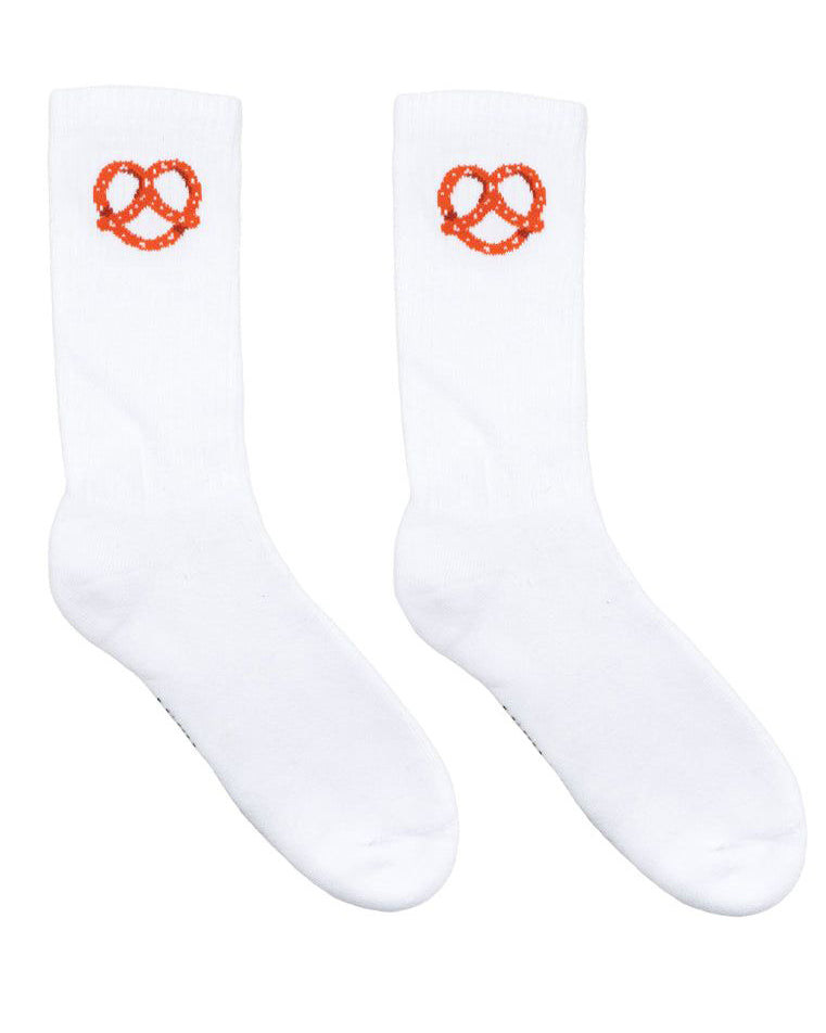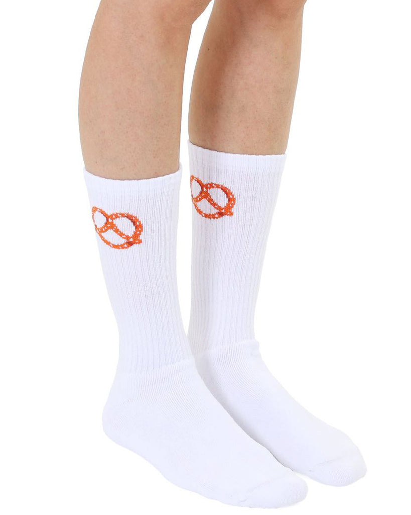 these classic crew socks are super soft and made with the highest quality fabric to make sure your feet are warm and cozy. socks feature ribbed tubing, seamless toes, super padded soles, and a fun pretzel graphic on the leg. unisex socks make a great gift!