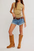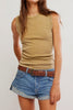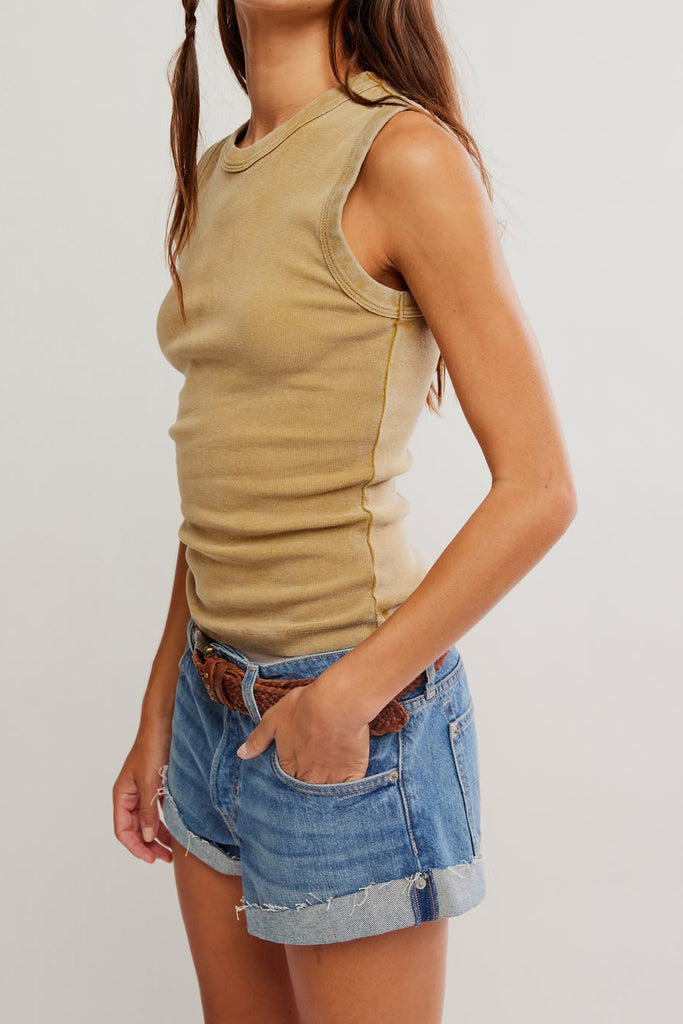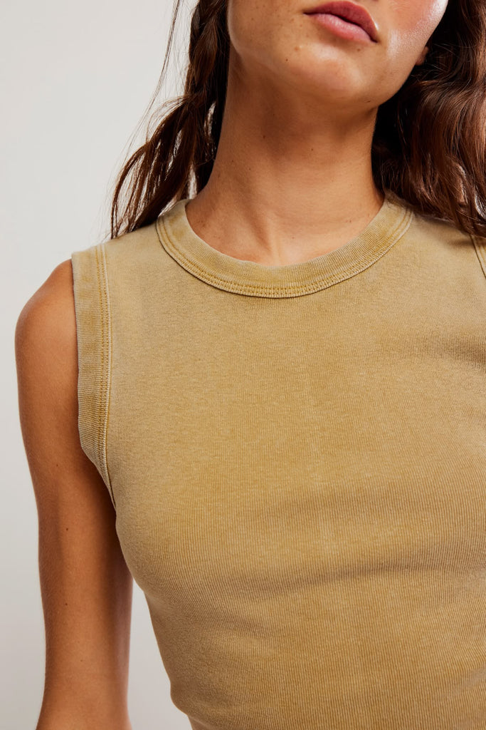 Personify Shopfree people knit tank in washed olive-hued khaki color. comfortable top has a sleeveless, fitted silhouette and features a high crew neckline, wide straps, and a center seam detail on back. sleek, versatile top has a relaxed, yet polished look that works for everyday wear.