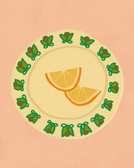 Personify Shopcolorful art print featuring a patterned plate and a bit of fresh produce. giclee print is on high-quality matte paper and is available in two styles.