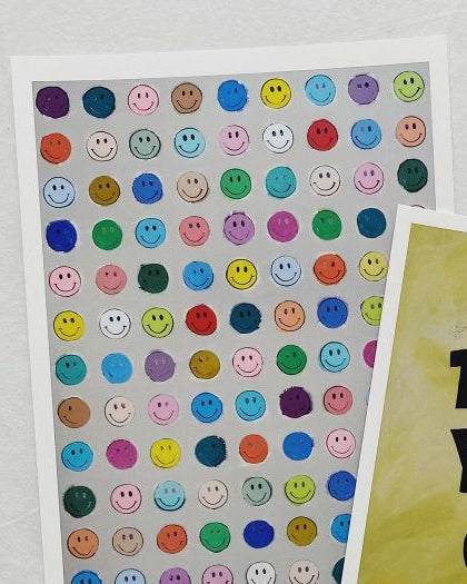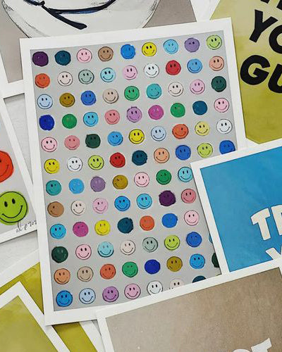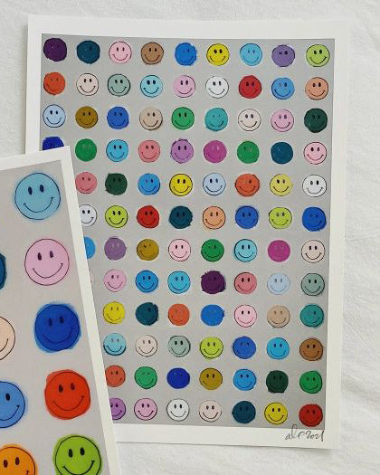 Personify Shopprint by fayetteville, arkansas based artist alex bodishbaugh. she creates with the belief that art can be bright, bold, and still packed with meaning. print features 108 cheery smiley faces in a rainbow of colors.