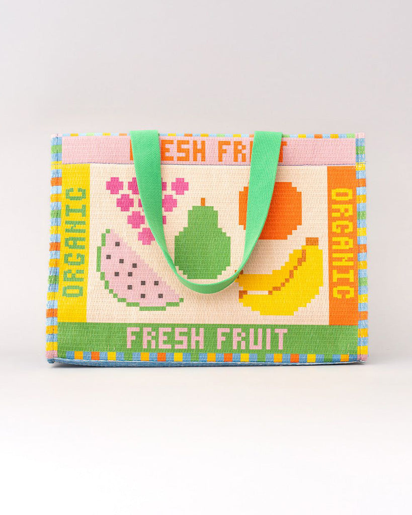 Personify Shoprattan weave gives this bag an easy, breezy vibe while the fruit tile pattern adds a sweet little twist. bag is roomy enough for farmers market finds, beach day treasures, or the stack of books you definitely needed to bring along. colorful bag is light to carry, lovely to look at, and always ready for an adventure.