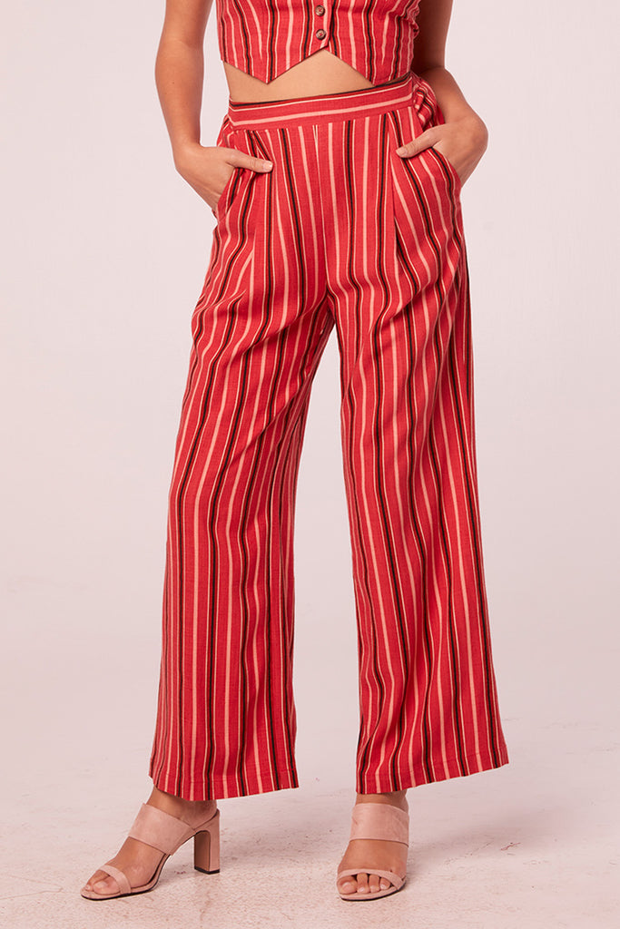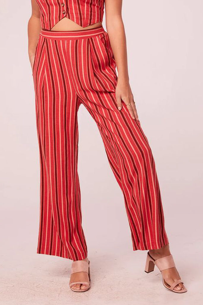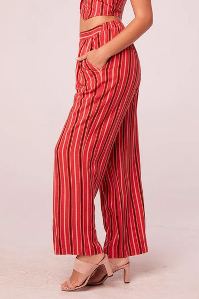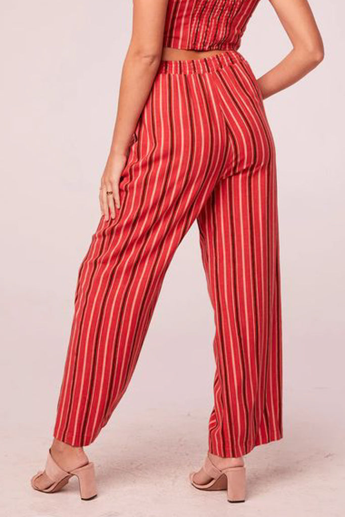 Personify Shopvintage inspired pants in fiery red coral striped pattern. pants feature a high-waisted fit with side pockets, trouser-like feel, and a smocked back waistband for ease of fit. pants are loose fitting and run slightly big. pair with tanks, bramis, or graphic tees for a cute look this spring and into summer.