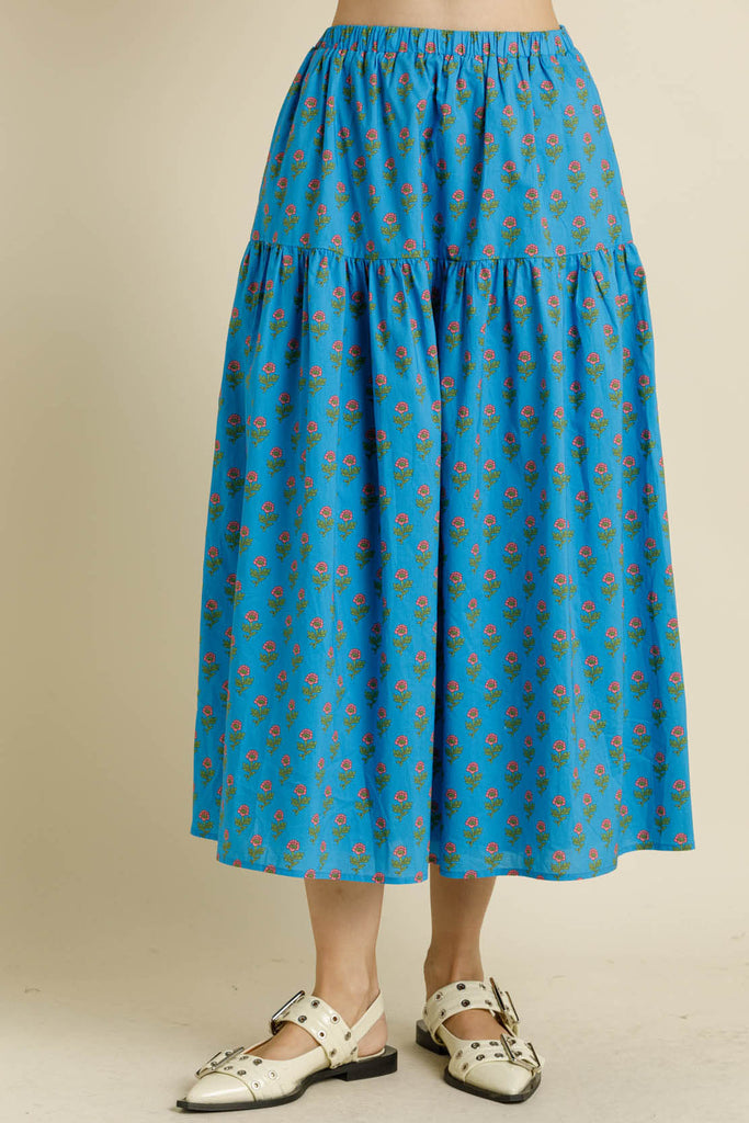 Personify Shopmidi skirt in bold blue with a lovely poppy floral pattern. lined skirt is generously sized features a stretchy elastic waistband with gathered details and a full, flowy skirt. skirt can easily be dressed up or down; pair it with a basic tee for a casual vibe or wear it with a button down for a dressier look.