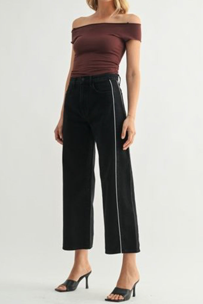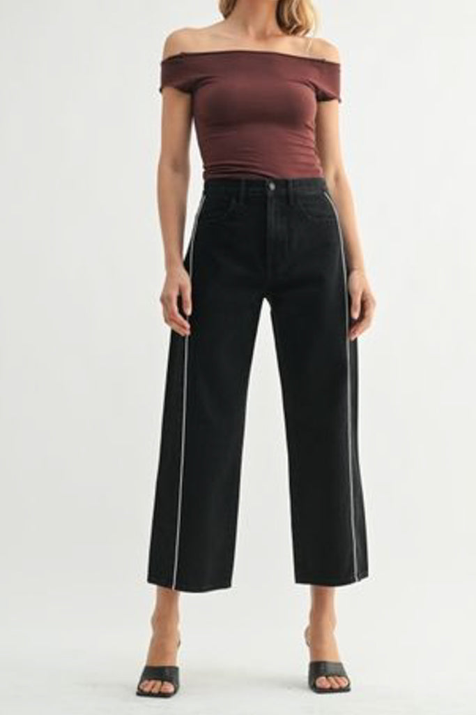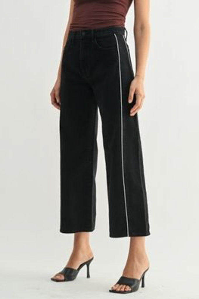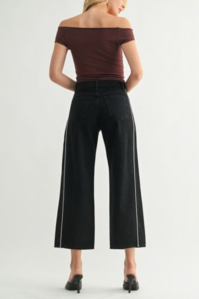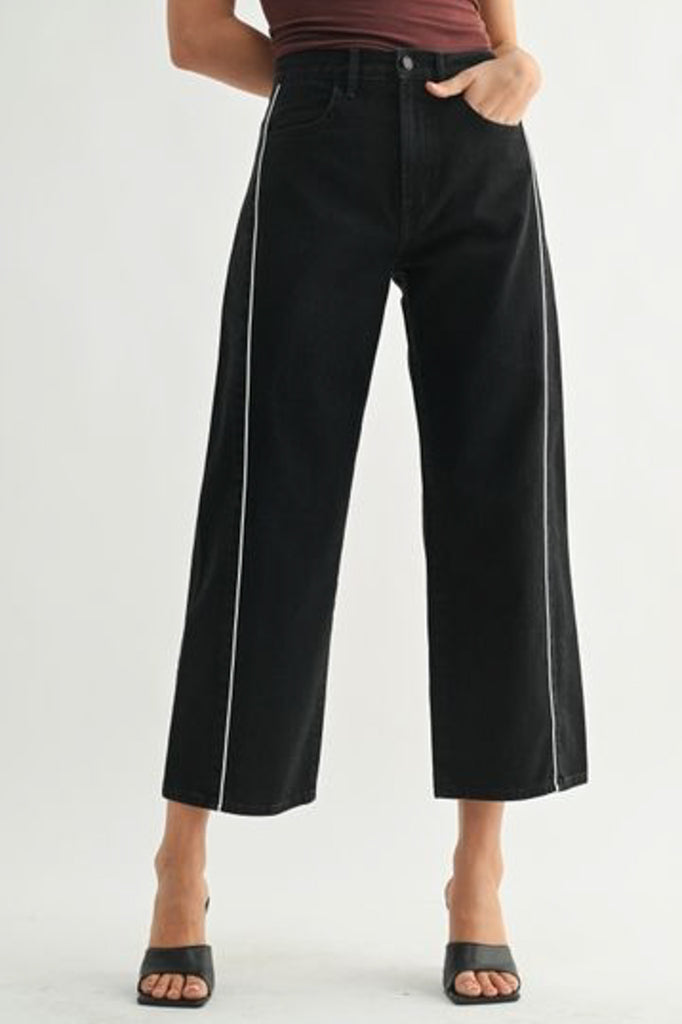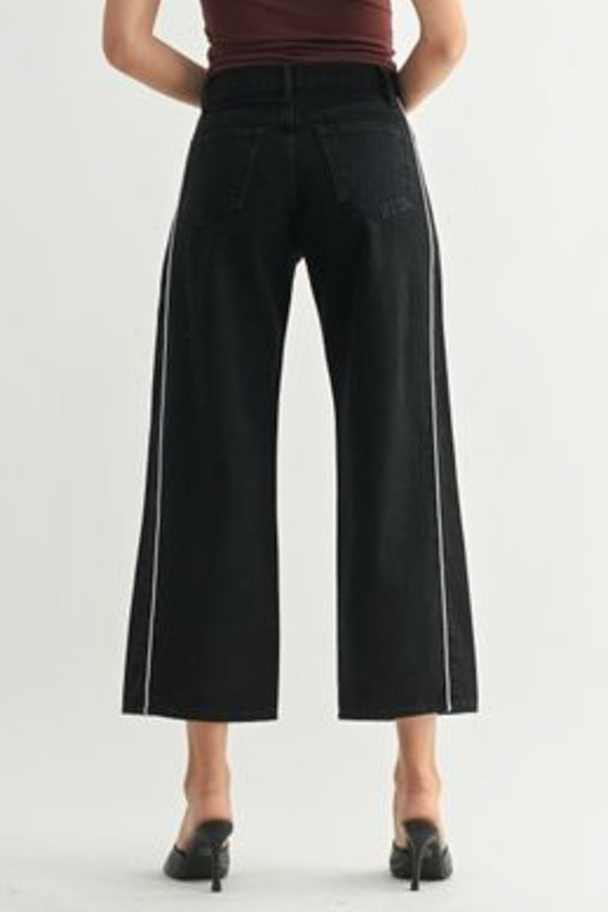 Personify Shopunique barrel leg jeans in black with special white stripe details on side and back. ankle-length pants feature a high-rise fit and a ballooned and tapered leg. pants have a sporty vibe that looks great with a graphic tee and sneakers, but pants can also easily be paired with a sweater or blouse for a more elevated look.