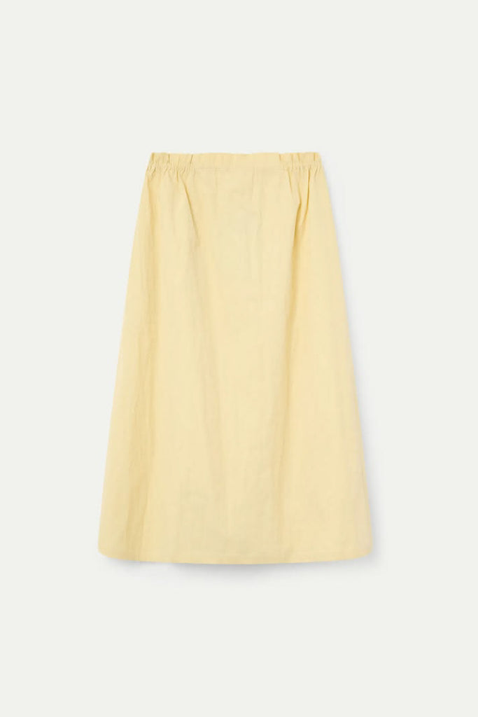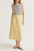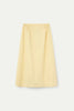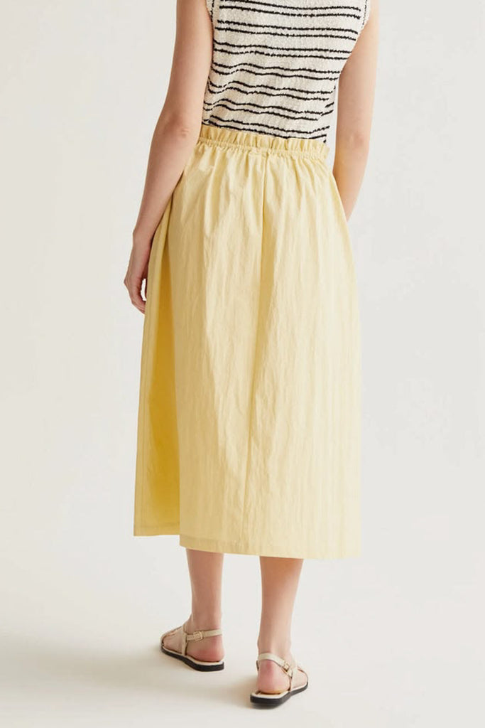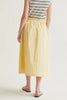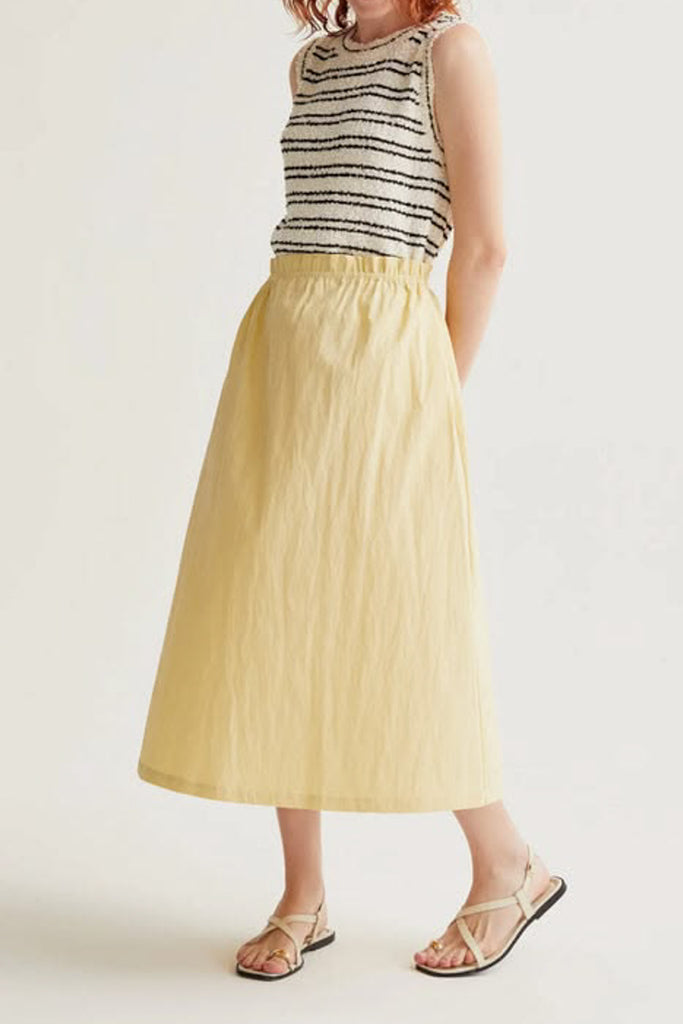 Personify Shopeasy to wear midi skirt made from a lightweight butter yellow material. pull-on skirt has an a-line silhouette and features a stretchy elastic waistband, side pockets, and a flowy fit. comfortable skirt is perfect for styling casually this spring and into the summer.