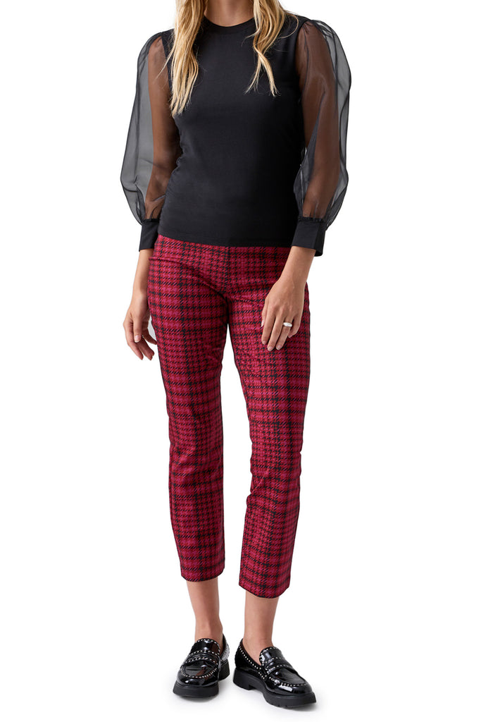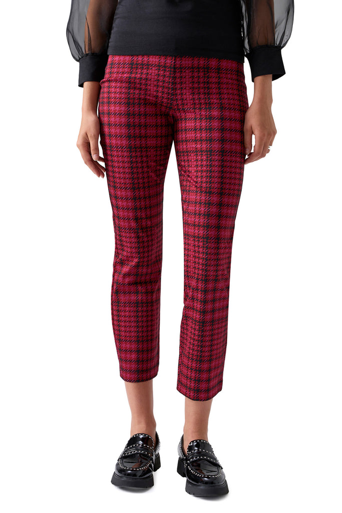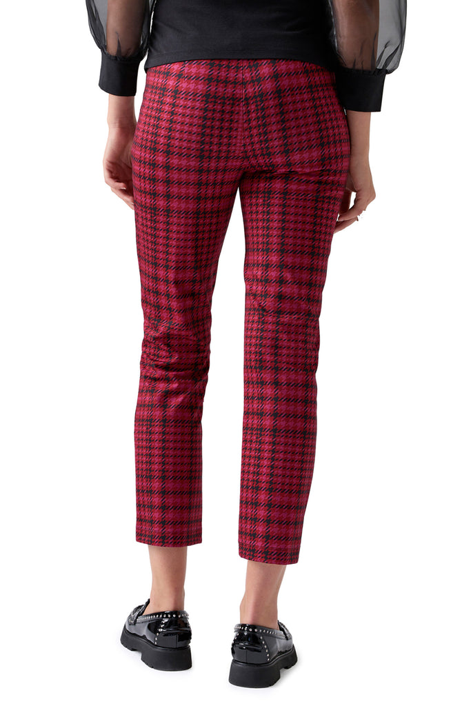 Personify Shopthe best pull on crop pants, this time in a festive pink-hued plaid pattern. pattern has a holiday feel with shades of orange, red, pink, and brown. cute pants feature a high rise fit with two faux front pockets and functional back pocket. pants can be styled with many different colors for a variety of looks. pants make comfortable and professional work wear and can also be worn as leggings.