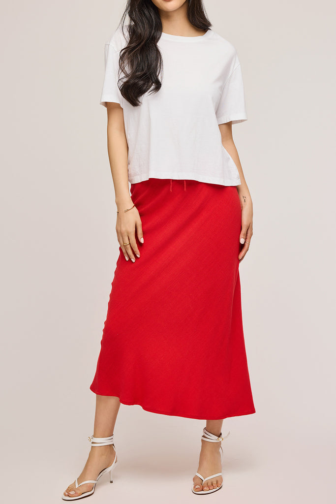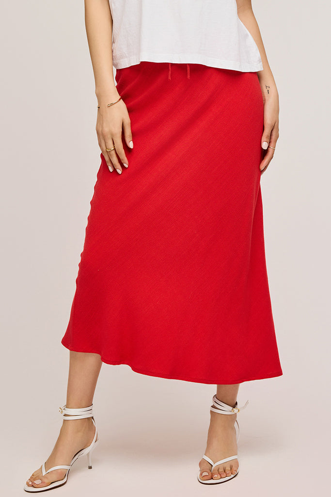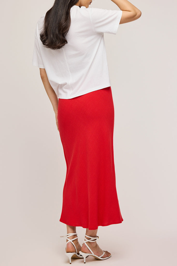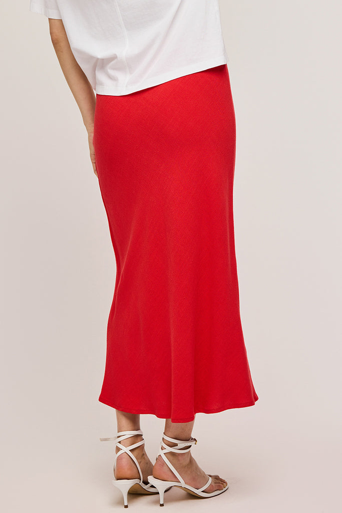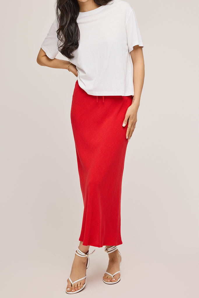 Personify Shopbold tomato red skirt made of a flowy linen blend with a lovely drape. bias cut skirt has an elasticated waist with drawstring that can be adjusted to be worn mid or high rise for styling versatility. midi length skirt is generously sized and easy, breezy - perfect for summer!