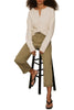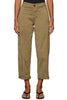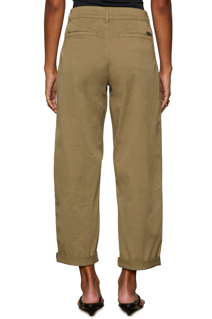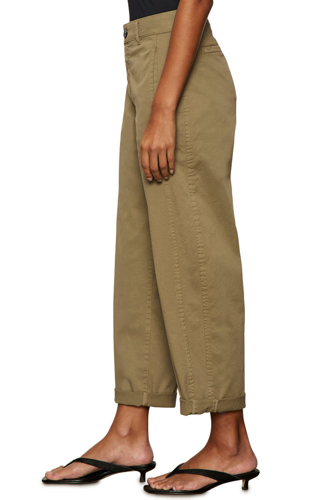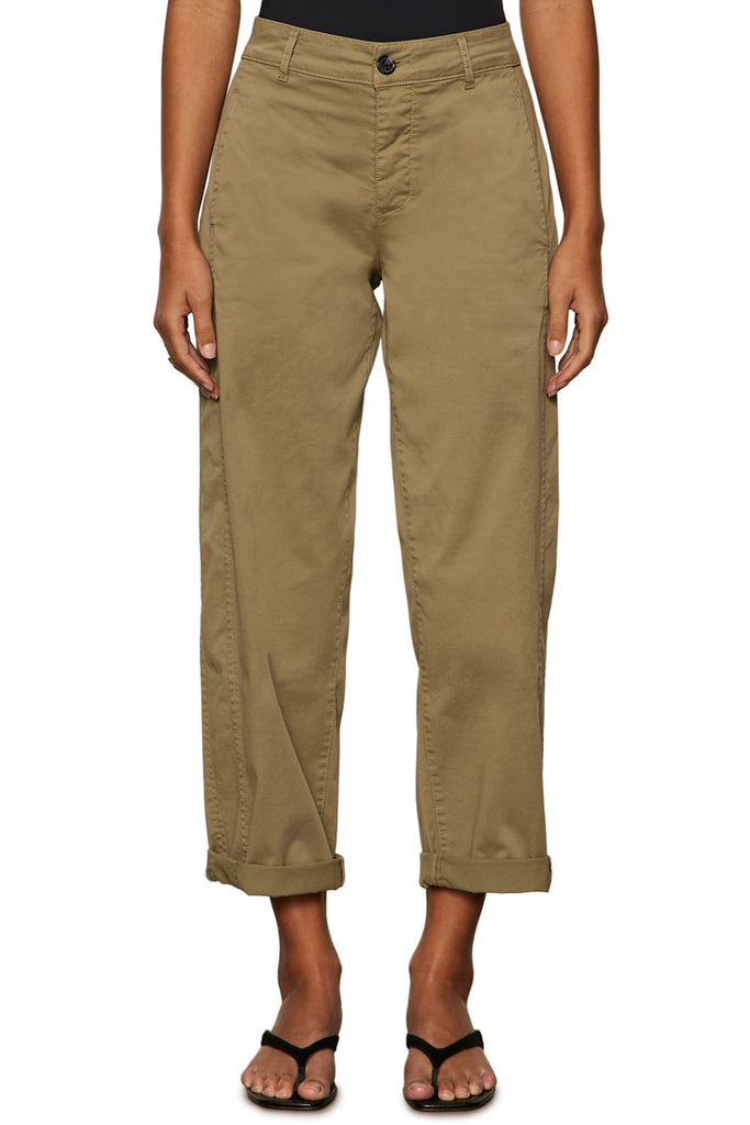 Personify Shopeasy to wear pants in muted army green. midrise pants are lightweight and have a subtle barreled leg. pants have a button fly closure, two front slant pockets, two back pockets, and a relaxed fit. pants can be styled with the hems rolled (as pictured) or unrolled. versatile pants can be worn casually with a tee or dressed up with a blouse for a more professional look.