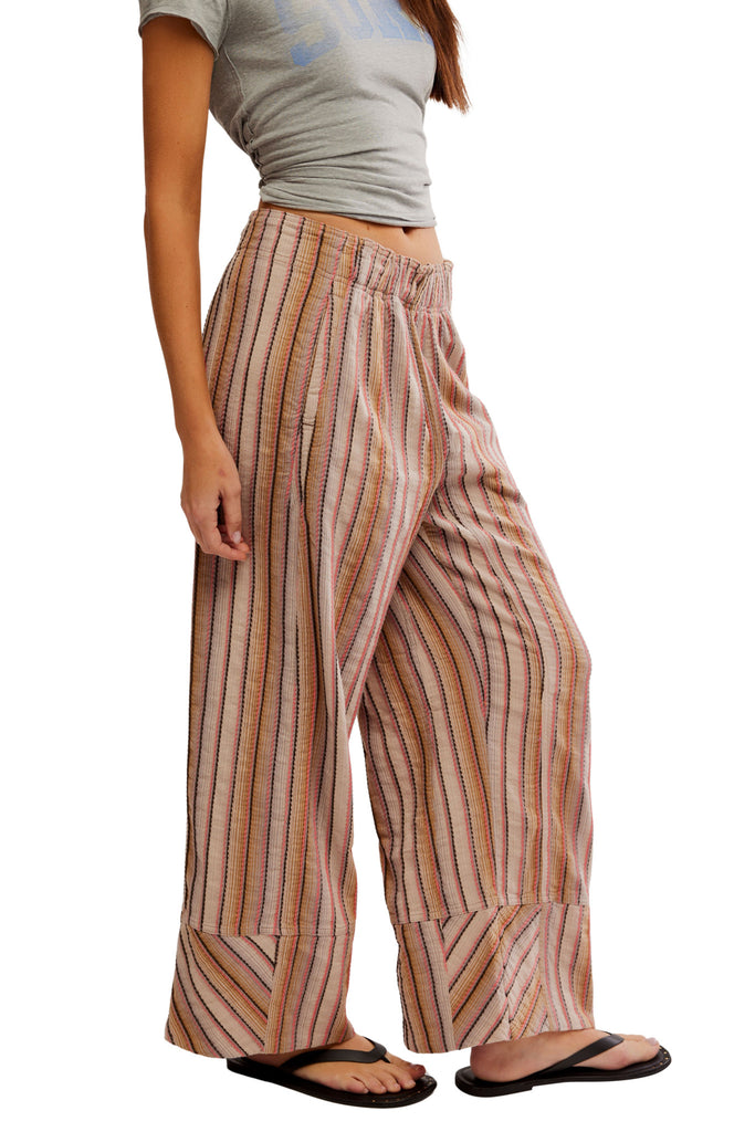 free people breezy and effortless striped pull on pants. mid-rise pants are generously sized and have a relaxed wide-leg silhouette. pants feature a soft yarn-dyed striped fabrication, stretchy elastic waistband, side pockets, and a contrasting striped wide bottom hem. easy to wear pants can be paired with a baby tee or thrown on over swimwear.