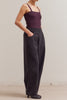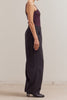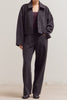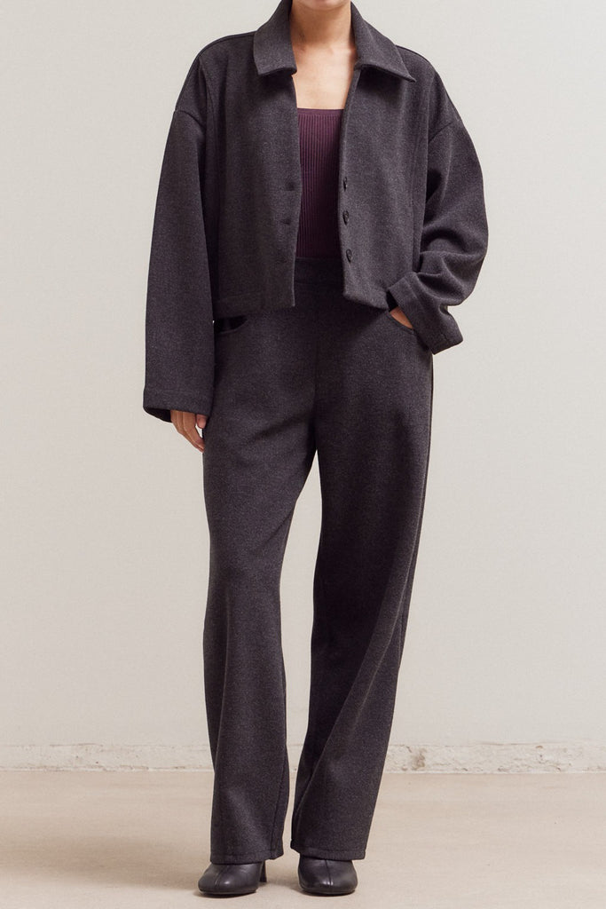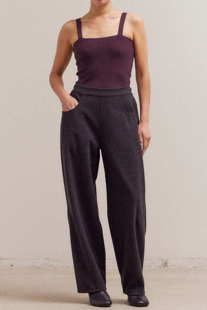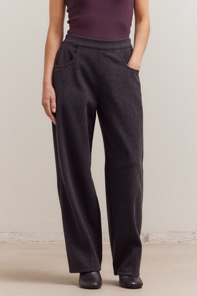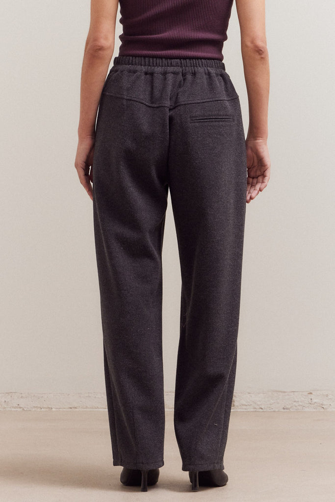 Personify Shopsoft trousers in charcoal grey. pull-on pants feature a stretchy elastic waistband, front pockets, pleated details, and a straight, wide leg silhouette. elevated pants are comfortable, easy to wear, and on trend.