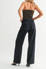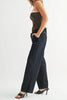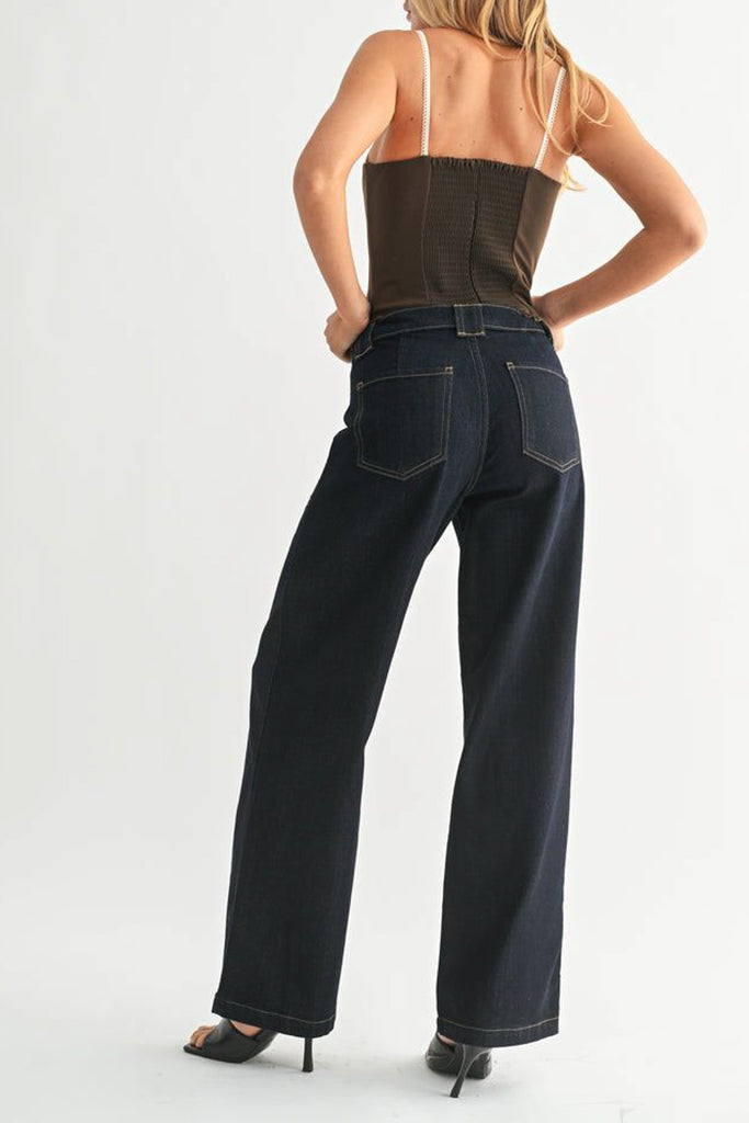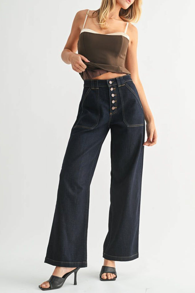 high rise jeans in a dark denim wash. jeans feature an exposed button fly, slim hips, defined utility-style pockets, and wide legs for a sleek, elongated silhouette. stylish jeans are perfect to style casually with a graphic tee or dress up with a blouse or sweater.