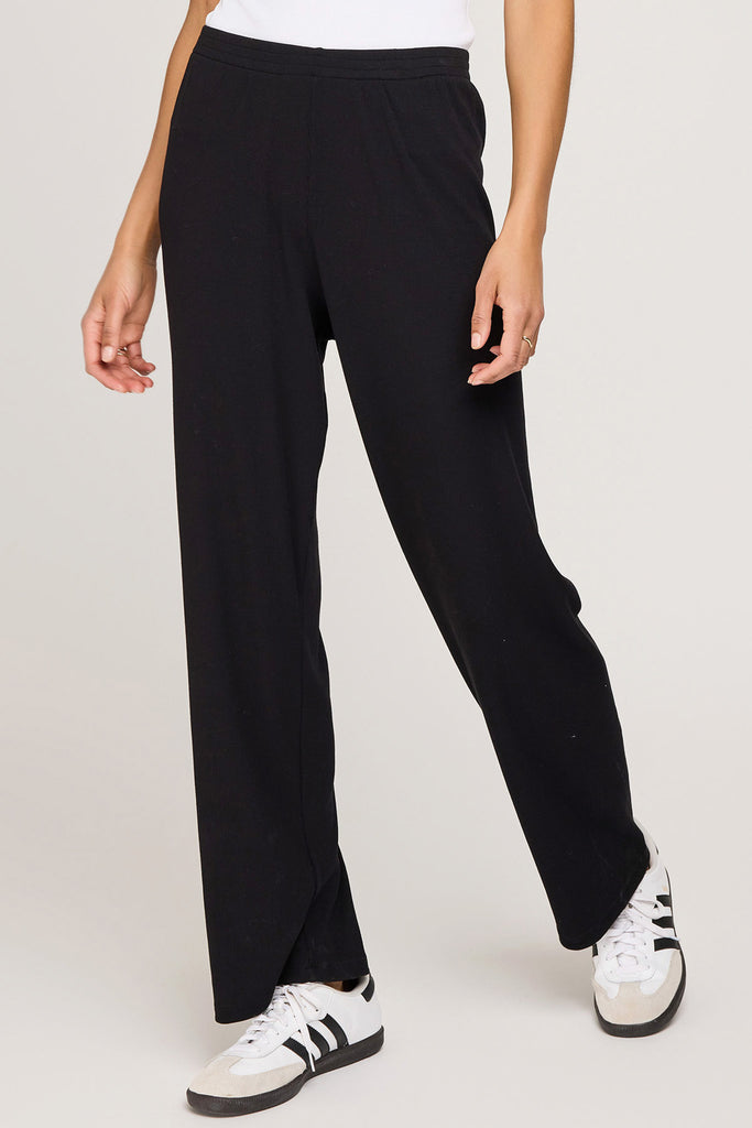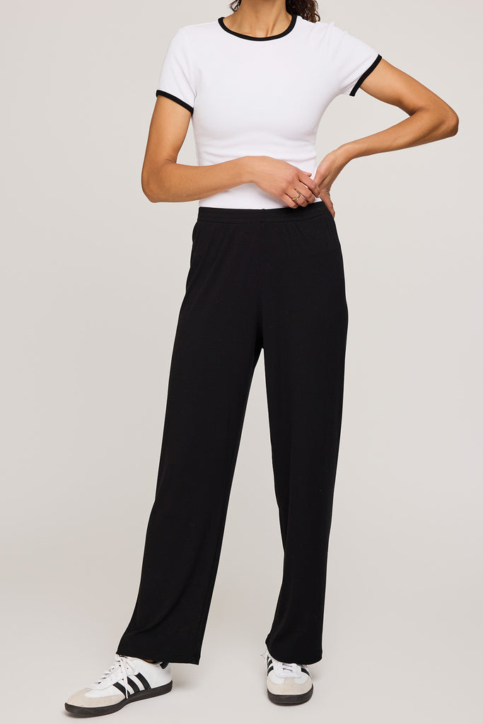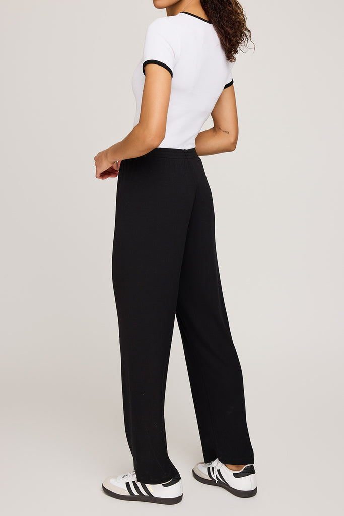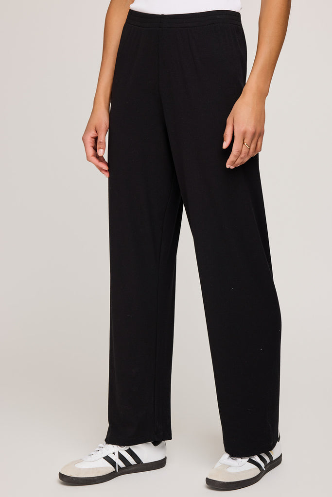 Personify Shopblack pants made of a ribbed fabric with the perfect amount of stretch. full length pants feature a stretchy elastic waistband for comfort, a high rise, and a straight leg for an on-trend look. pants have an effortless silhouette that is perfect for casual wear. pair with the shania tee for a cute lounge wear set.