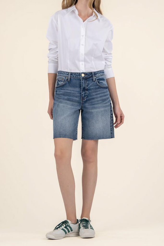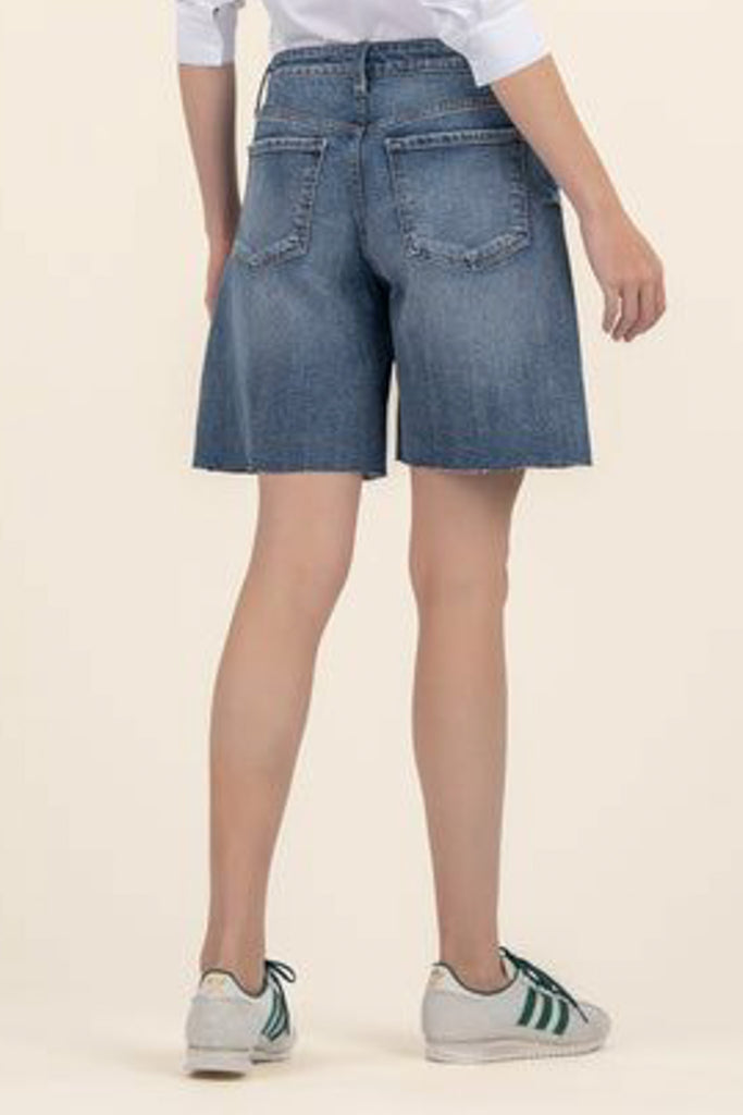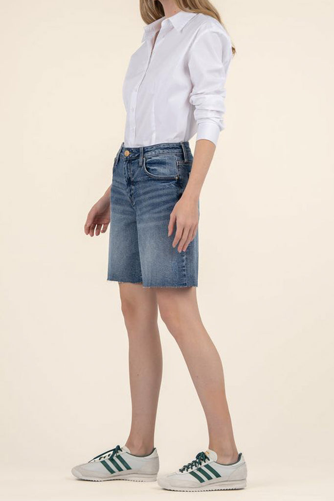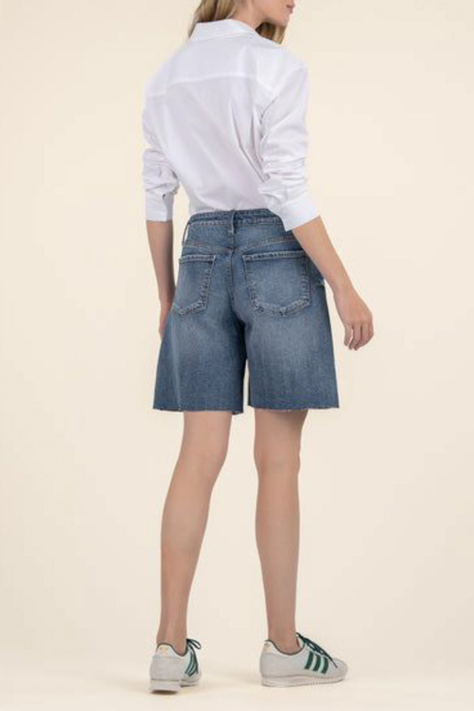 embrace the return of the bermuda short with these dark wash denim shorts. shorts have a high-rise waistband with a loose, relaxed fit and a raw edge hem, giving shorts an edgy, contemporary vibe. casual shorts are easy to wear bottoms for summer. note: shorts run a little big.
