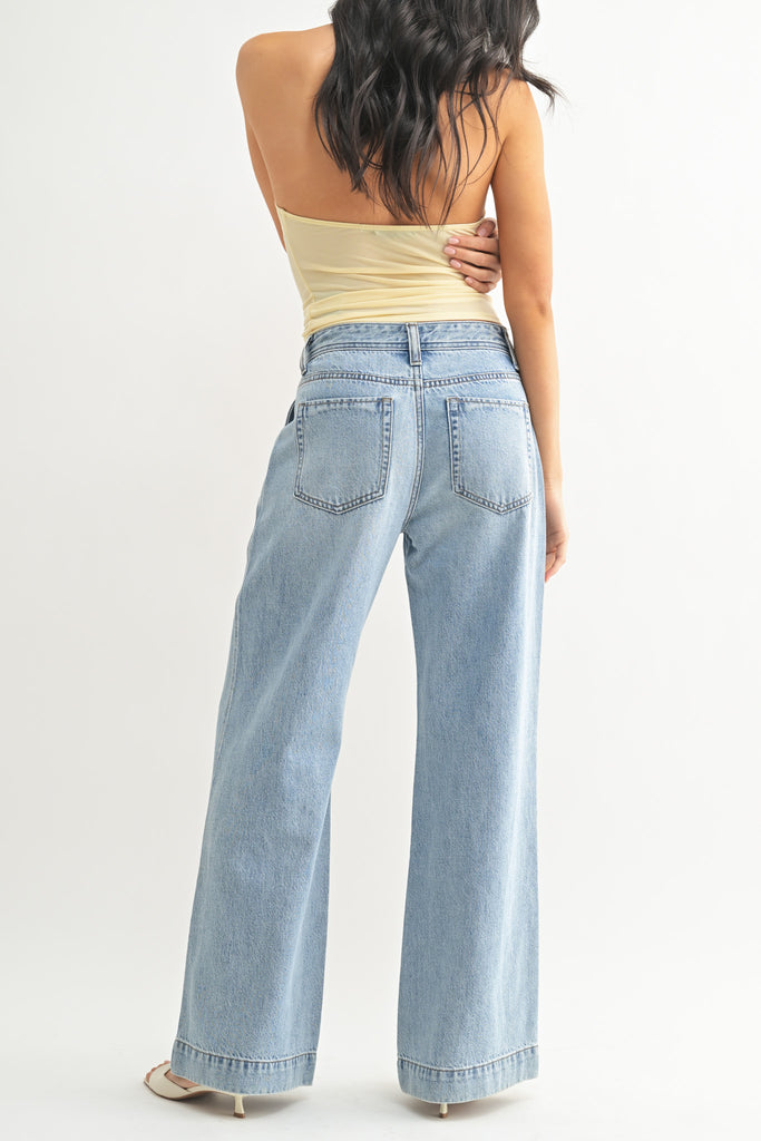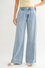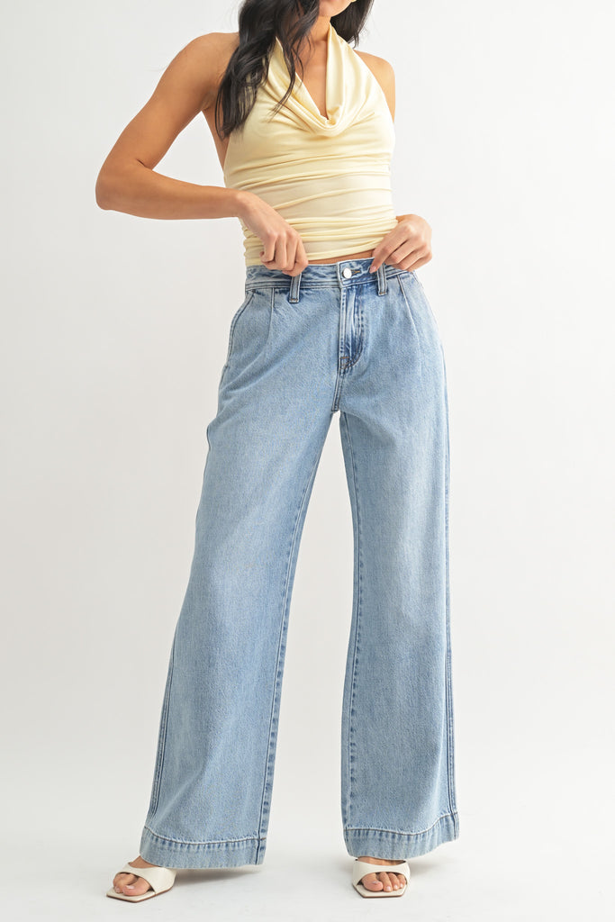 Personify Shoprelaxed trouser-style jeans in a light denim wash. mid-rise pants have a soft, comfortable fabrication and feature pleated details on front, side and back pockets, and a wide leg silhouette. fresh feeling jeans are great casual bottoms to bring into the spring and summer.