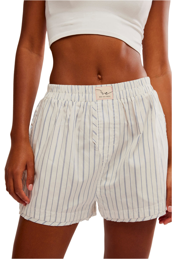 Personify Shopfree people laid-back boxer shorts in ivory with blue pinstripes. comfy cotton-blend shorts have a high-rise, relaxed fit and feature a stretchy elastic waistband with logo tag, side pockets, and contrast stitching. this simple staple looks cool solo or layered under your favorite bottoms. wear them at home or out and about for a casual, summery look.