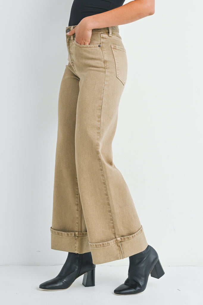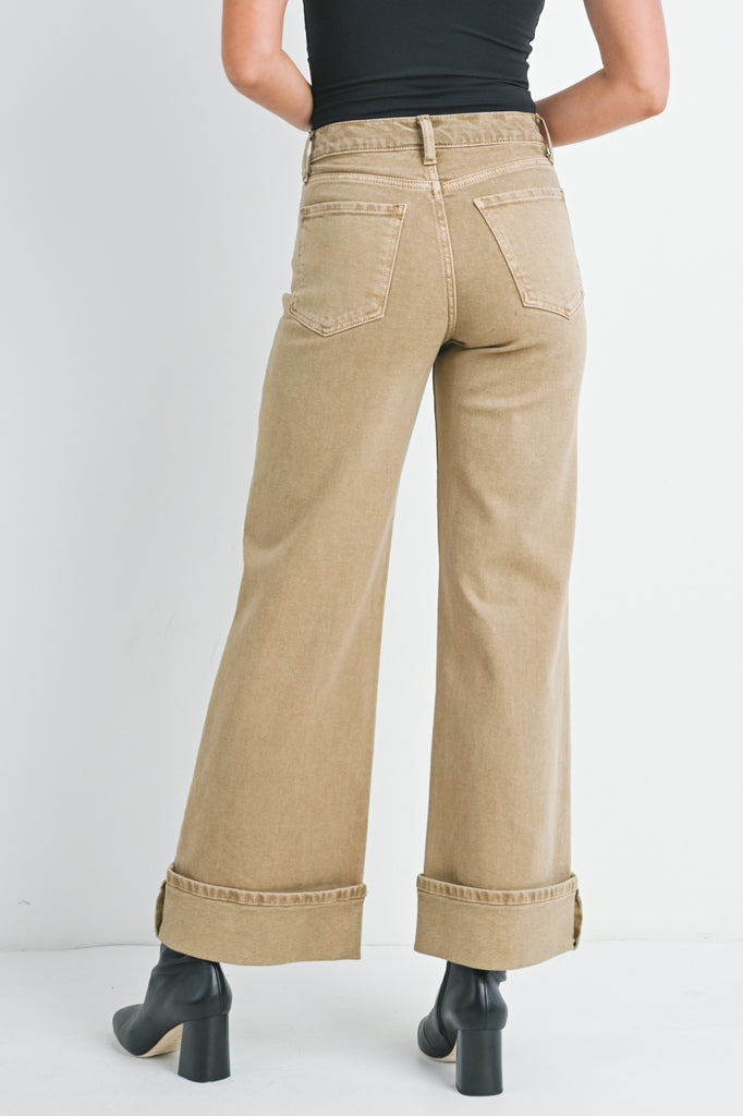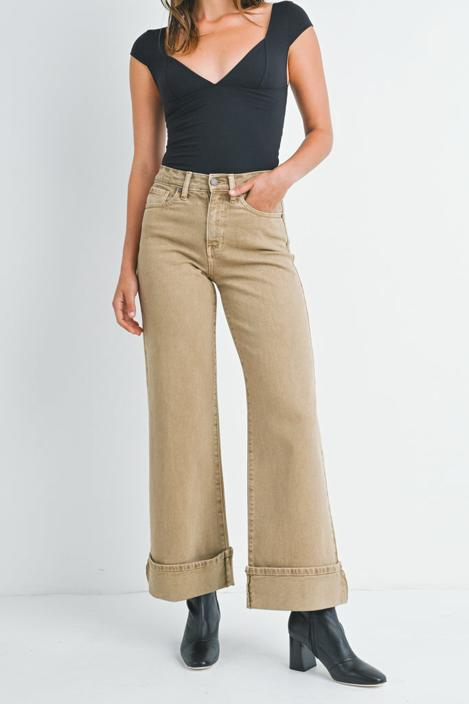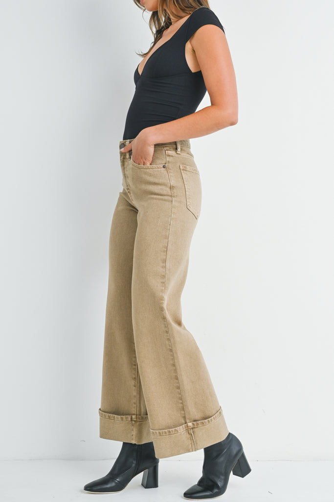 Personify Shopa fun update to a fan favorite pair of jeans! these cuffed palazzo jeans come in a versatile khaki color. jeans have a high-waisted fit with wide legs and a slightly flared ankle with a wide folded cuff. cuff is sewn at the side and the seam can be removed to adjust the cuff and length as needed. please note: due to the nature of the dyed fabric, these pants do not stretch as much as other blue denim jeans, so consider sizing up.