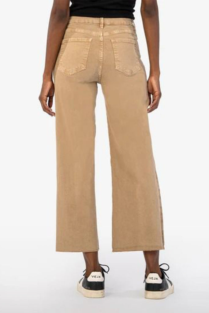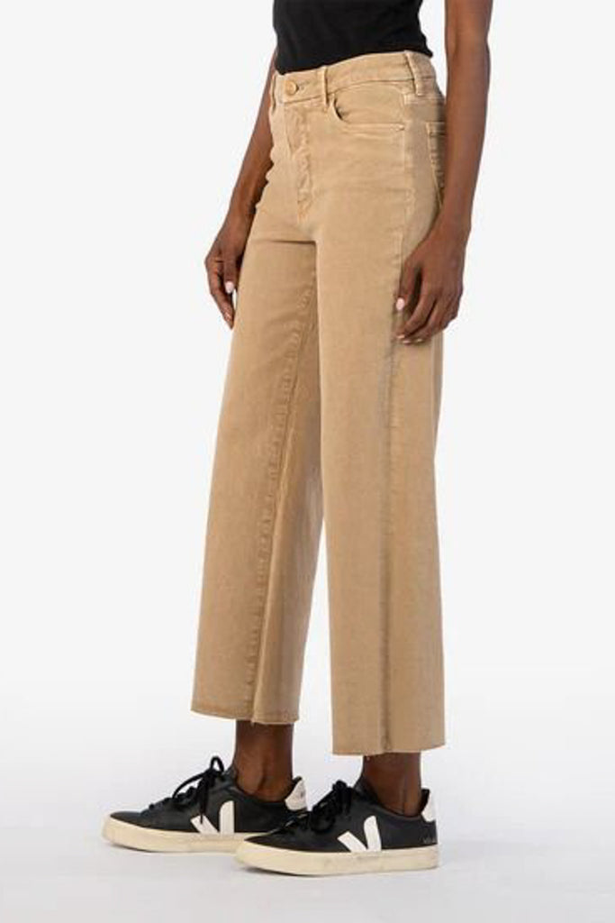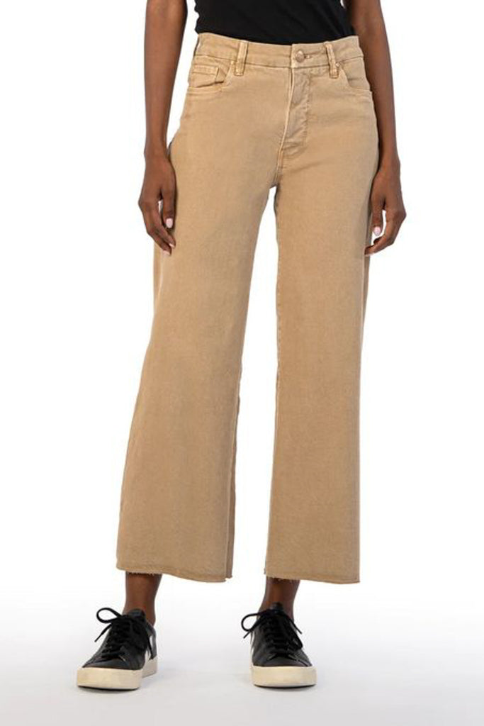 Personify Shopsoft, low stretch wide leg jeans in springy toast color. high-rise jeans fit slim through the thighs and flare out to trendy, ankle-length raw edge hems. jeans have a casual and cool look that is perfect for spring!