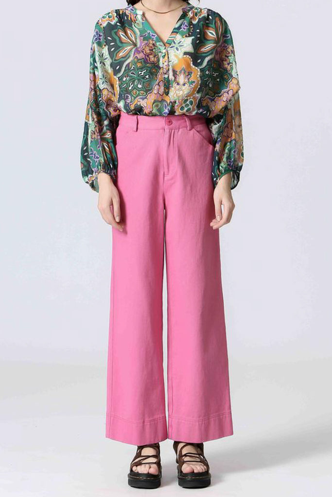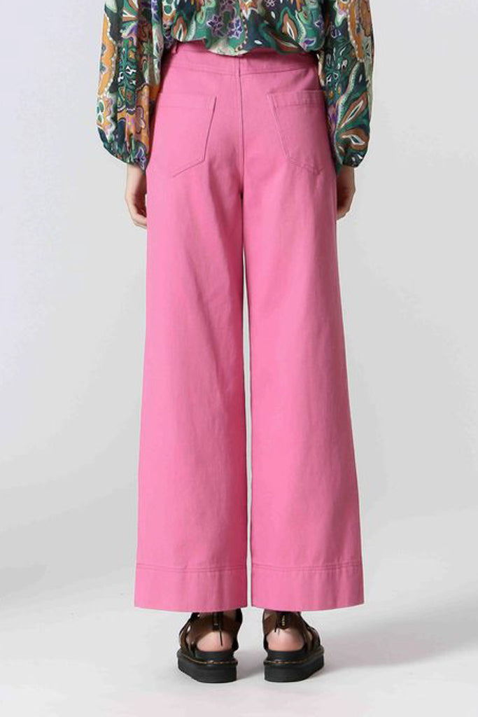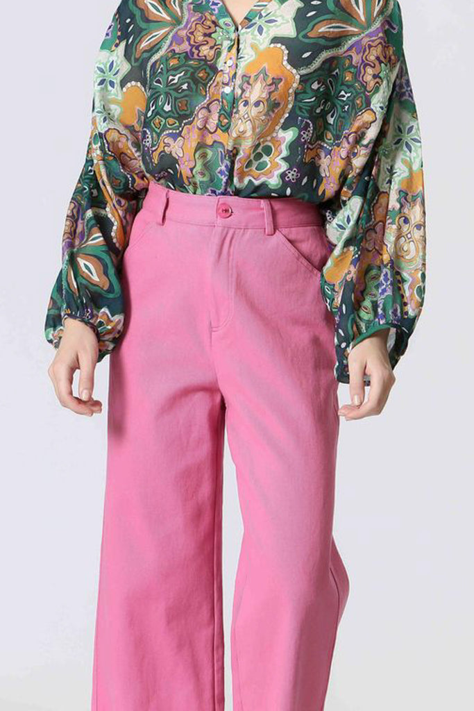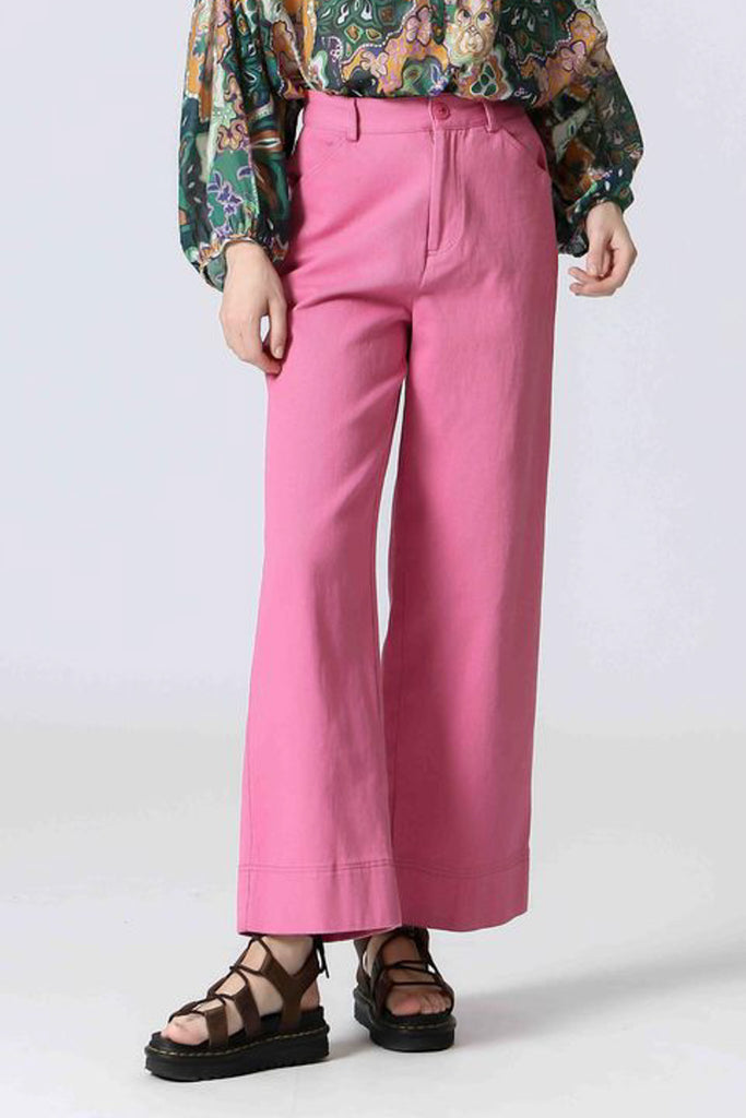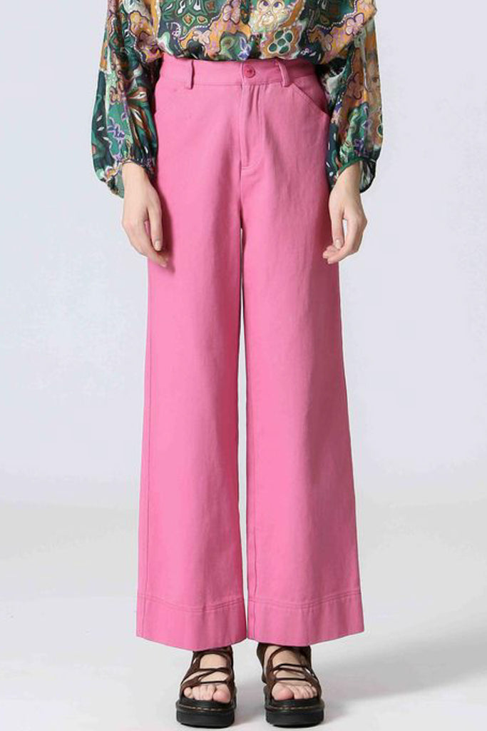 Personify Shoplightweight cotton twill pants in bold bubblegum pink. pants have a retro vibe with a super high-waisted fit. pants feature side and back pockets, a wide leg silhouette, and a wide bottom hem. pants run true to size.