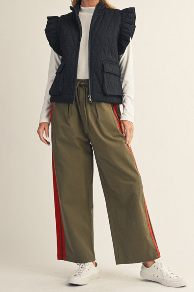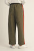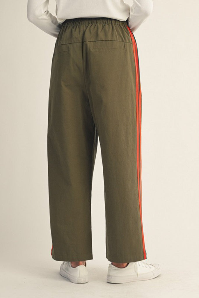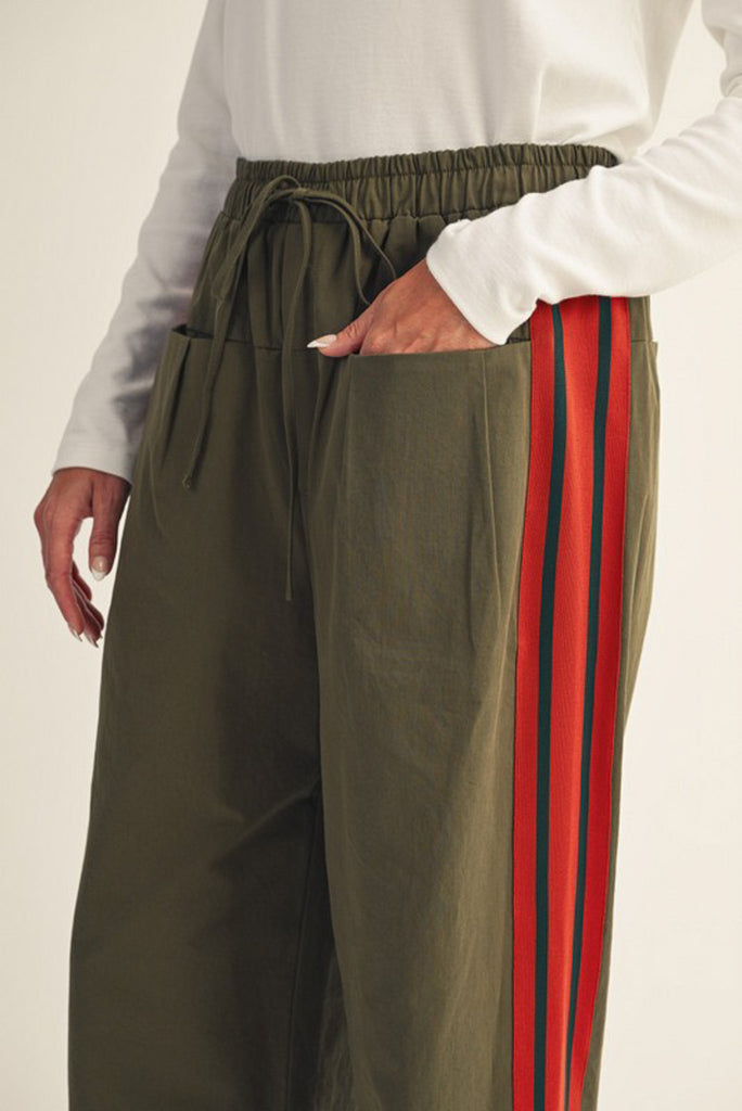 Personify Shopcasual track pants in olive green with stripe details in orange-red and black. pull-on pants have a high-waisted fit and feature a stretchy elastic waistband with drawstring, unique front pockets, a wide leg silhouette, and a relaxed fit. pants make great casual bottoms for the fall.
