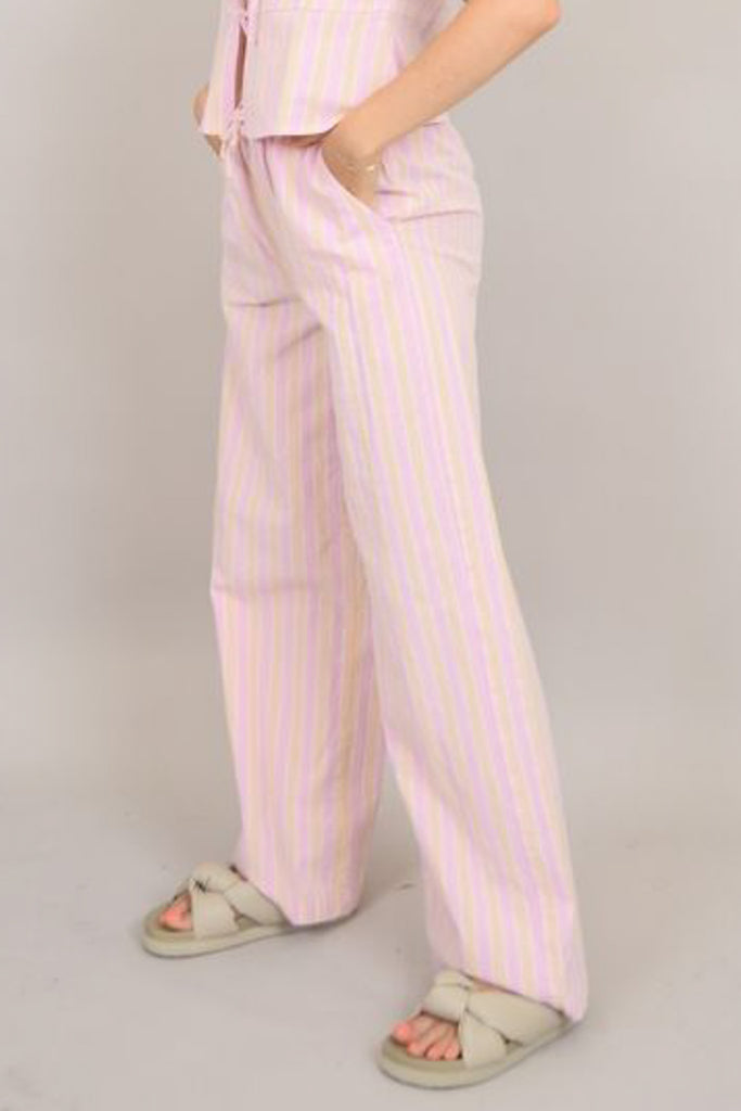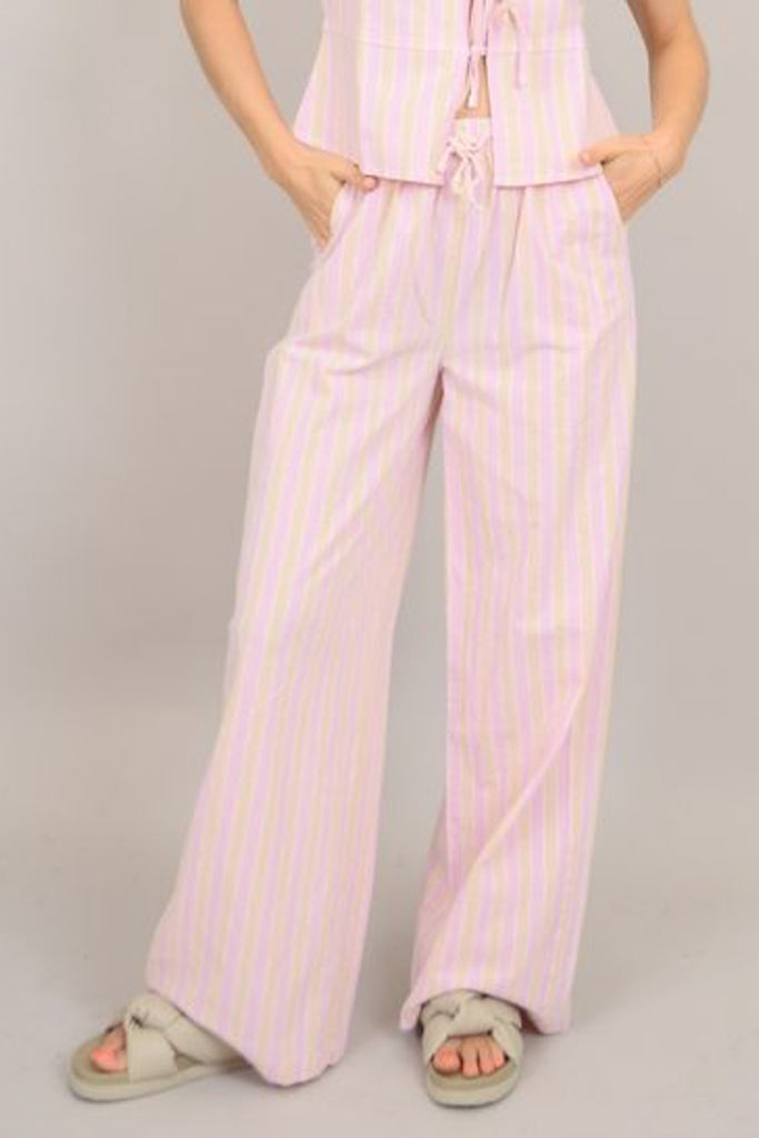 Personify Shopcasual pull-on pants with a sweet pink and yellow stripe design. mid-rise pants are generously sized and feature a stretchy elastic waistband with drawstring, side pockets, and a roomy, wide leg silhouette. cute pants are lightweight and perfect to wear with a tank or tee this summer.