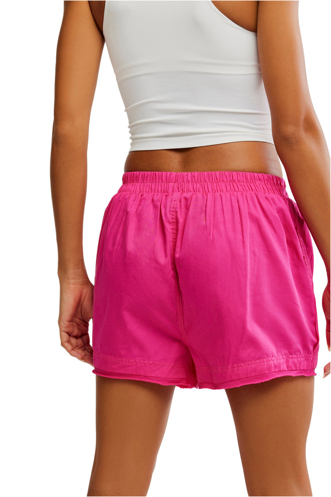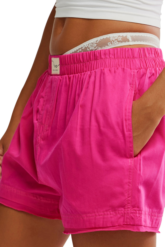 Personify Shopfree people laid-back boxer shorts in hot pink. comfy cotton-blend shorts have a high-rise, relaxed fit and feature a stretchy elastic waistband with logo tag, side pockets, and contrast stitching. this simple staple looks cool solo or layered under your favorite bottoms. wear them at home or out and about for a casual, summery look.