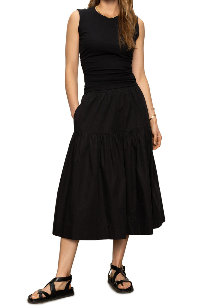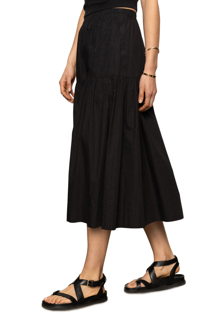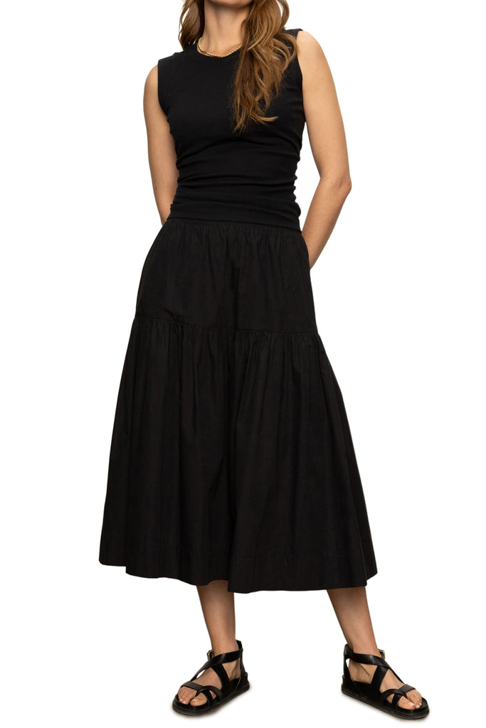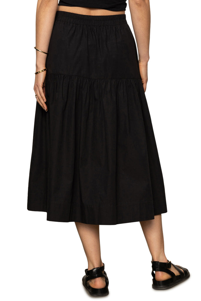 Personify Shopcotton poplin midi skirt in versatile black. high-rise skirt is lined to the mini length and features a stretchy elastic waistband, side pockets, and a flowy, relaxed fit. note: skirts runs on the smaller side; we recommend buying your true size or sizing up.