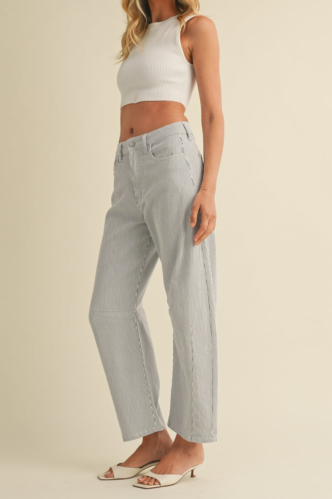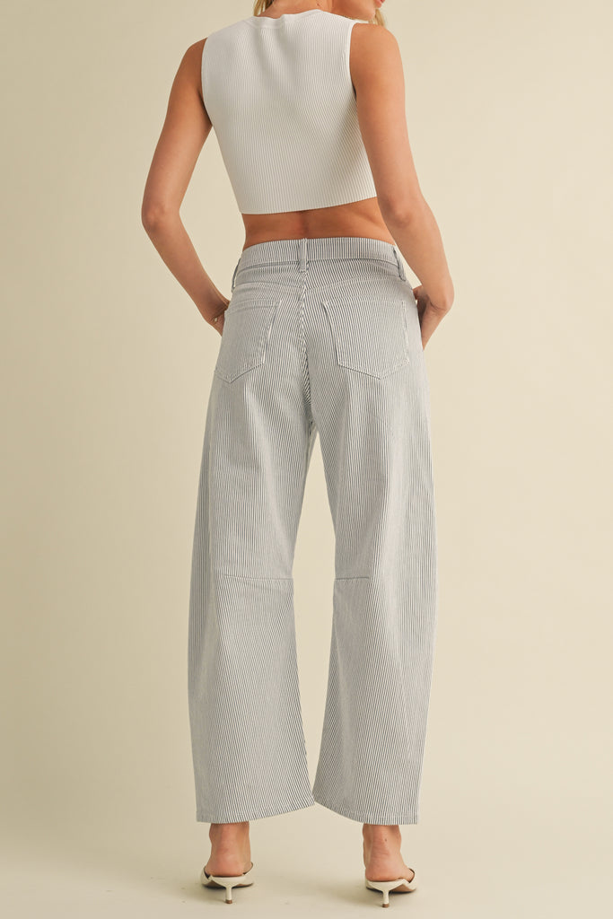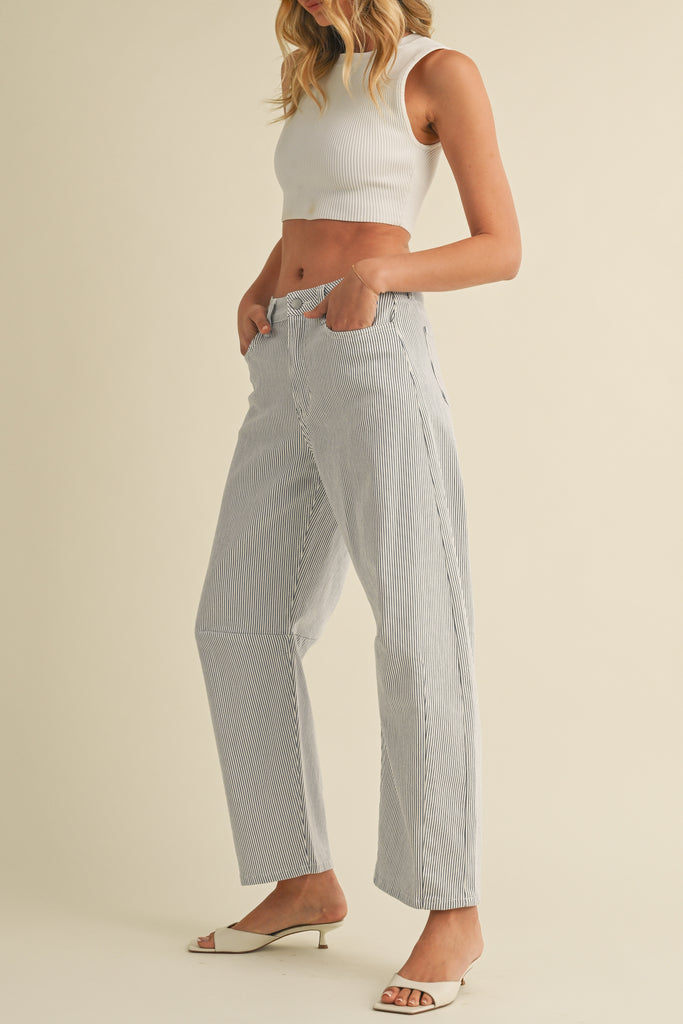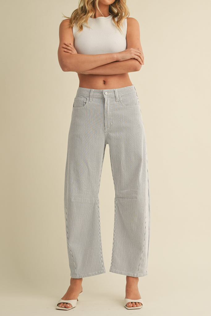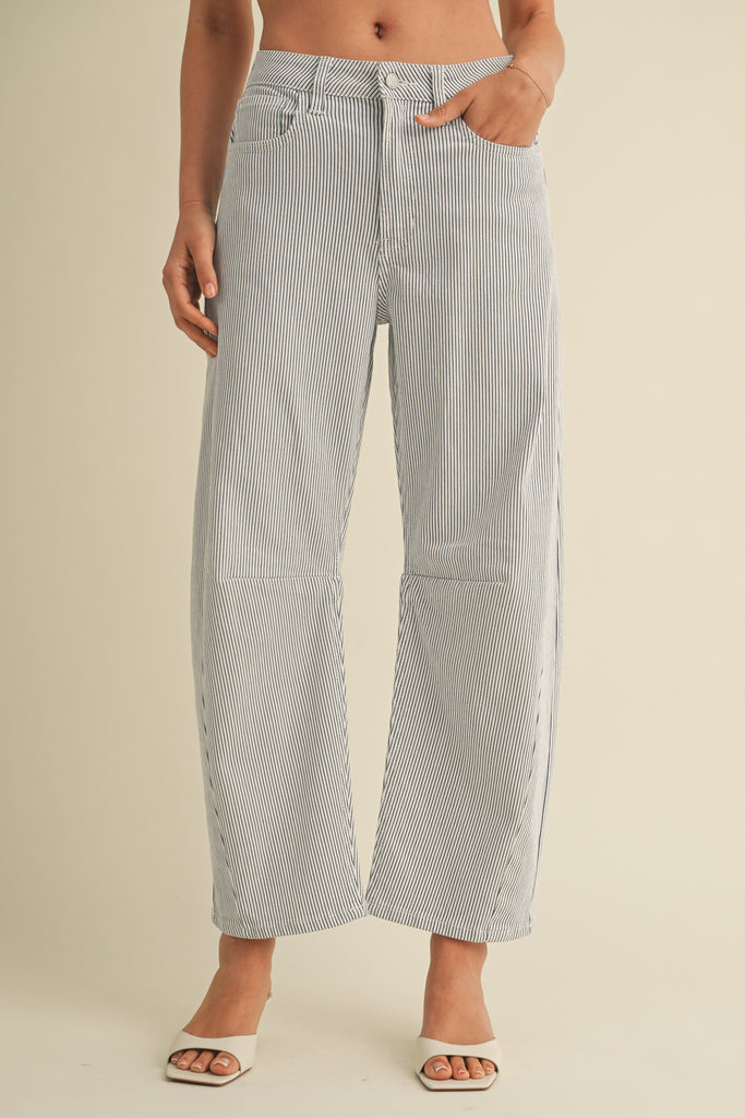 Personify Shopbarrel leg jeans with subtle blue and white railroad stripes. cool and casual jeans feature a high-rise fit, slightly barreled out wide legs, seam details at the knees, a cropped length, and a finished bottom hem. jeans are a little stretchy and run a bit big, so size down for a closer to the body fit. easy to wear jeans are laid-back, yet trendy, and have a great, comfortable fit.