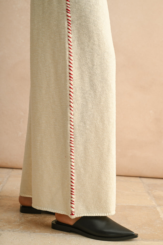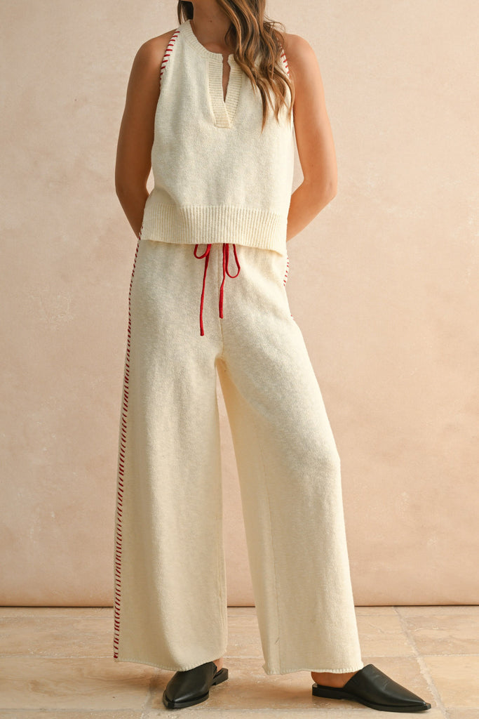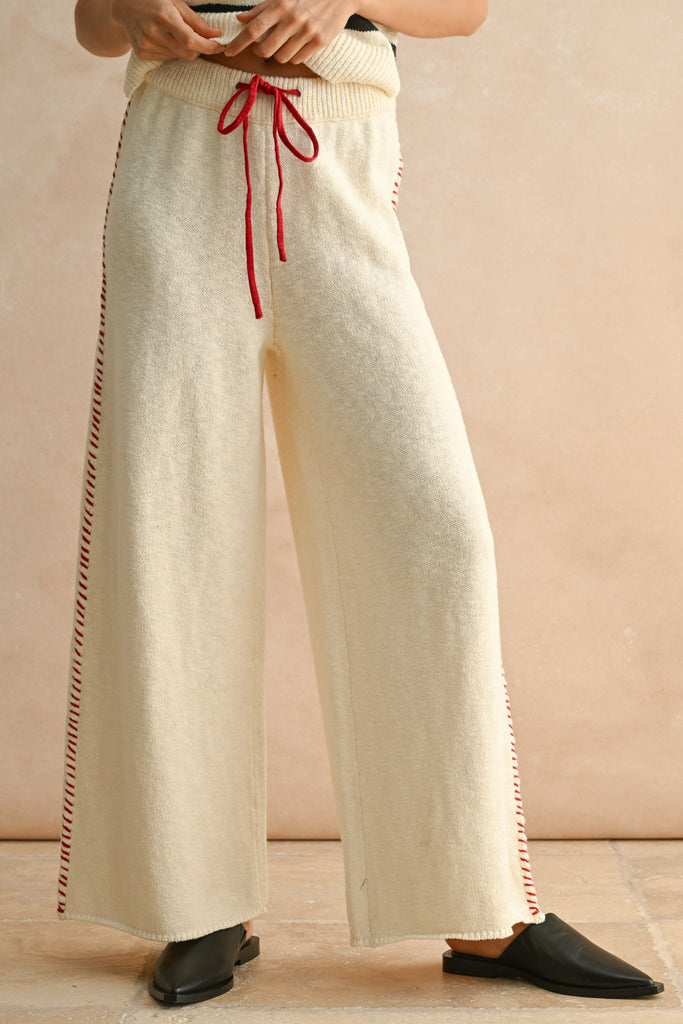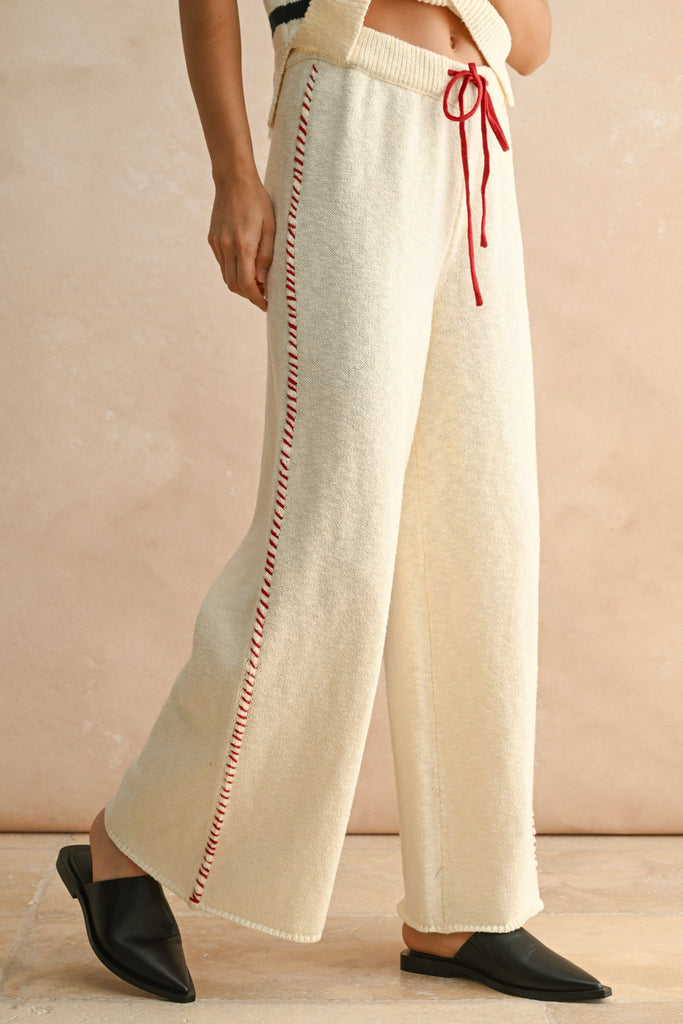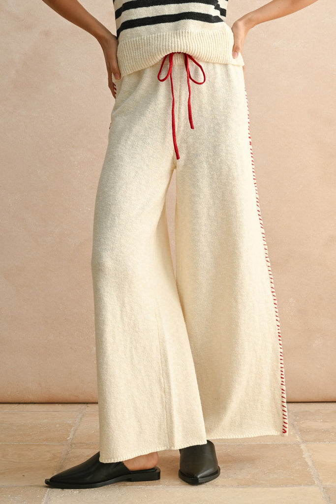 Personify Shopluxe feeling knit pants in beige. pants have a high rise fit and feature a stretchy elastic waistband with red drawstring, wide leg silhouette, and cute red whip stitching on sides. pair with the sofie blanket stitch knit top for the chic coordinated look pictured last or wear with your favorite top, tank, or tee to suit your own unique style.