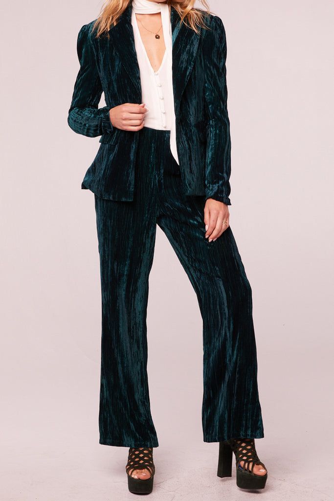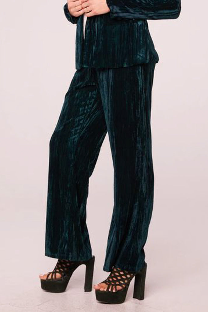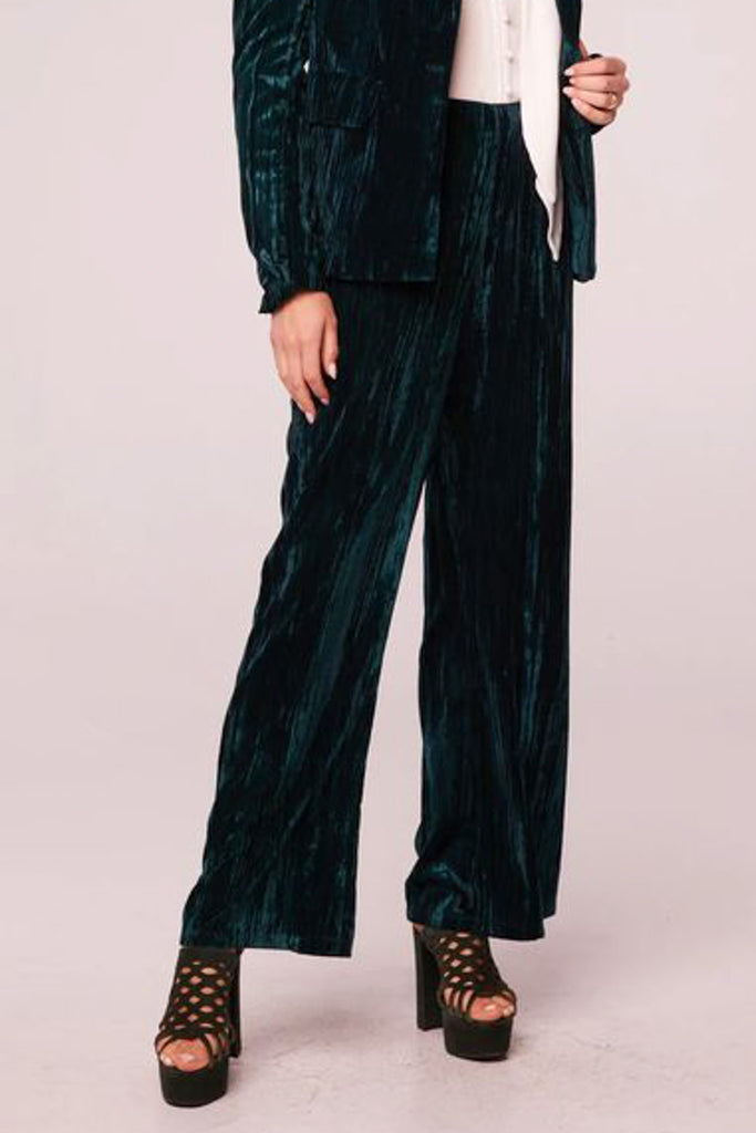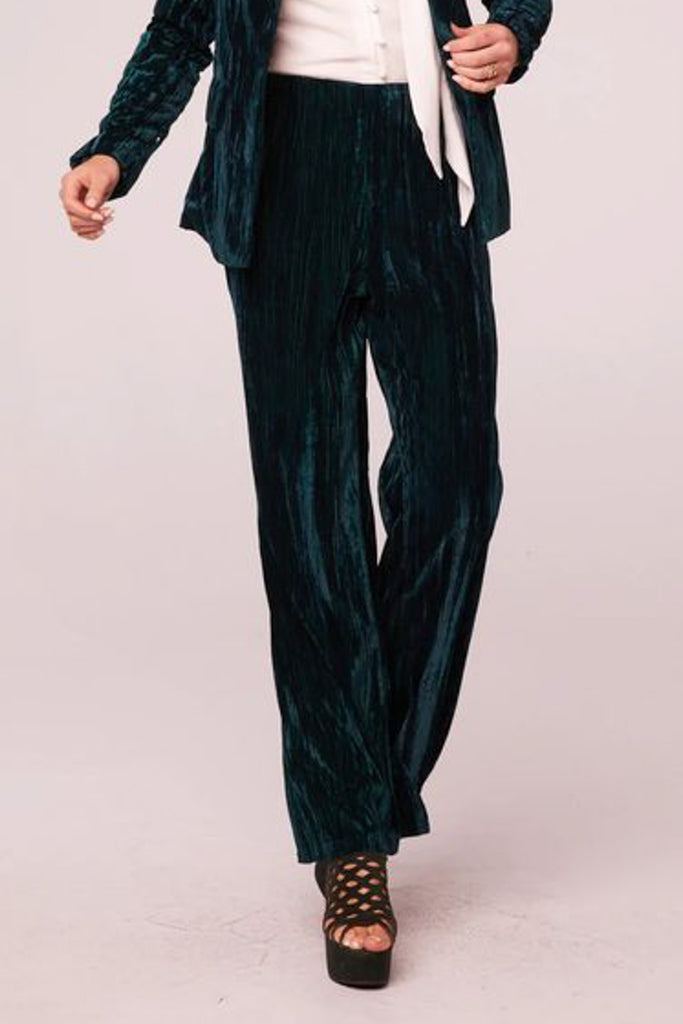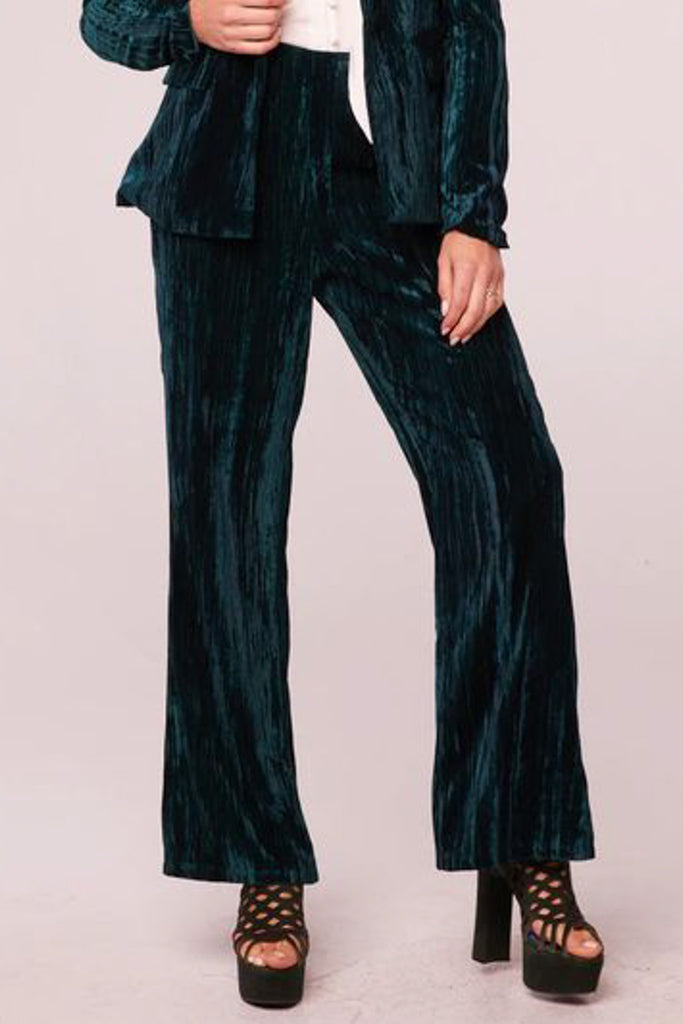 Personify Shophigh-waisted pants in stunning deep pine green crushed velvet. pull-on pants feature a stretchy elastic waistband and retro-inspired wide leg fit. pants make a fun and different option for holiday wear, but can be worn more casually paired with a graphic tee.