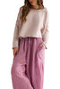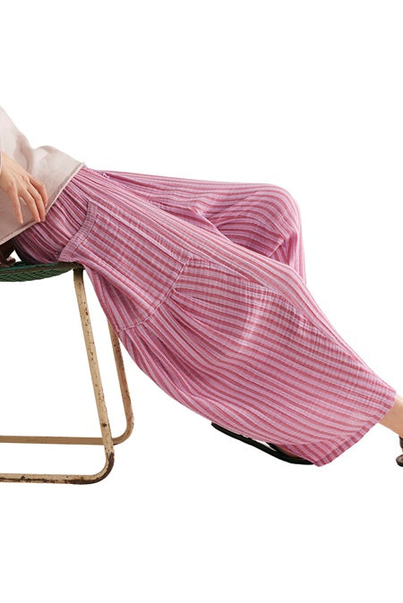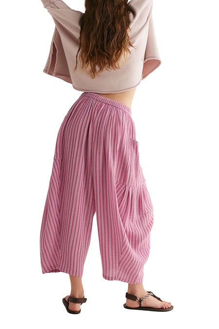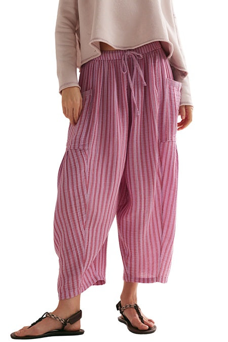 free people beachy pull-on pants in sweet raspberry pink stripes. lightweight cotton pants have a billowy, harem-inspired fit and feature an elastic waist with drawstring for pull-on ease, dropped side pockets, and a yarn-dyed striped fabrication. pair with a sleek bodysuit or beachy sandals for endless ways to wear.