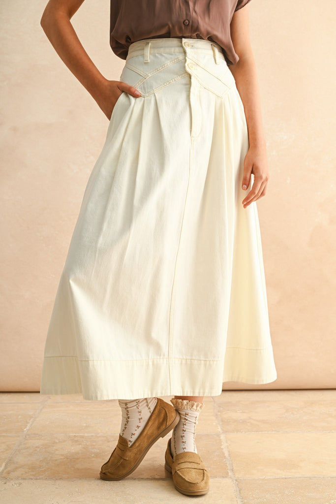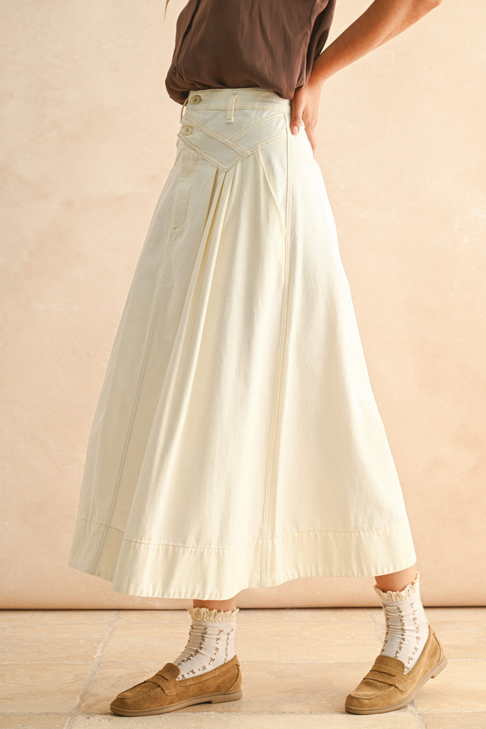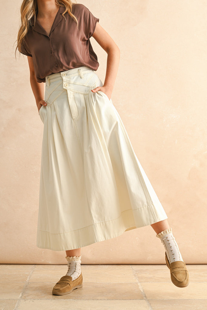 Personify Shopecru-colored midi skirt with special details on waist. high-rise skirt has a button and zipper closure and features unique stitched details at the waist, pleats, side pockets, and an easy, flowy fit. skirt runs true to size and makes a versatile piece to wear this summer, into the fall, and again in the spring.