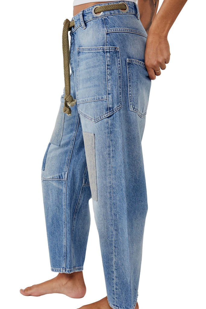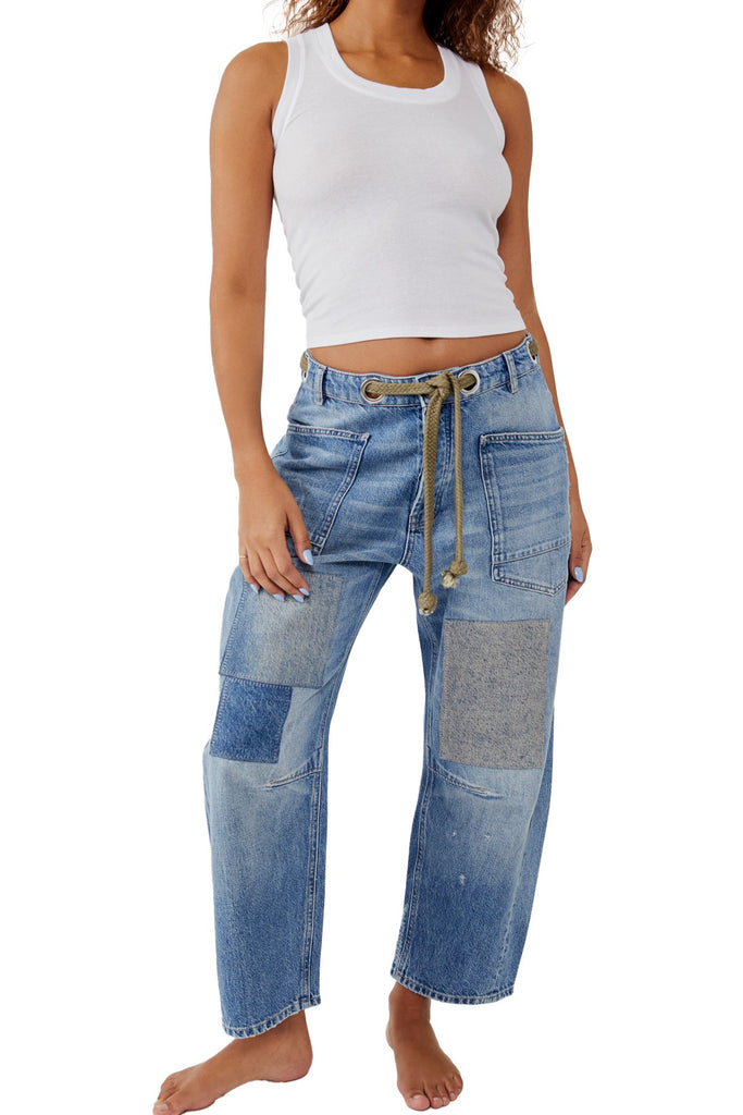 Personify Shopfree people cool and contemporary jeans in a nice wash with patchwork details. rigid, non-stretch denim jeans have a low slung, slouchy fit with a tapered silhouette; jeans slightly barrel out at the knees, giving pants their unique shape. pull-on jeans feature oversized patch pockets, and a contrast drawstring waist. fun and different jeans run large and are meant to be worn baggy, but can be sized down for a more fitted look.