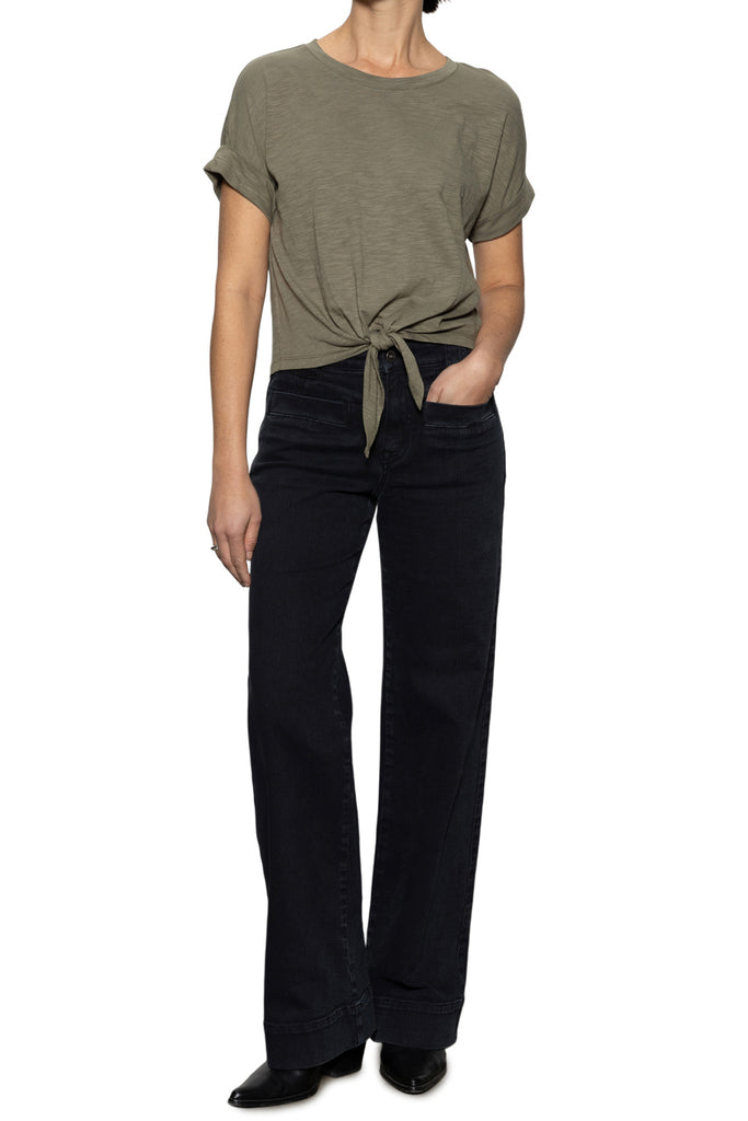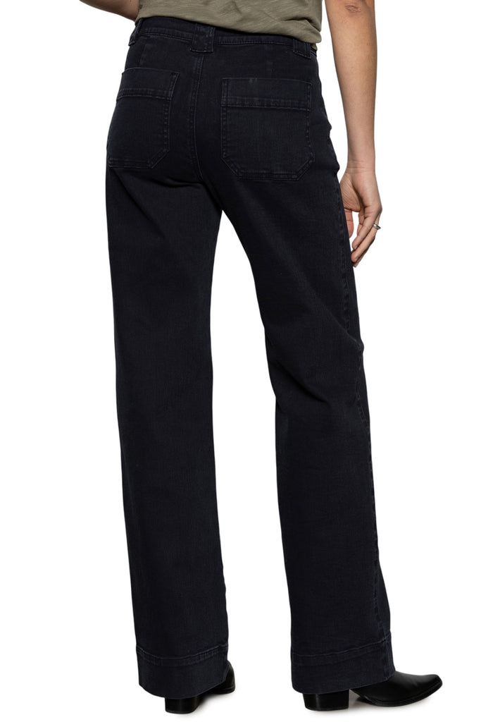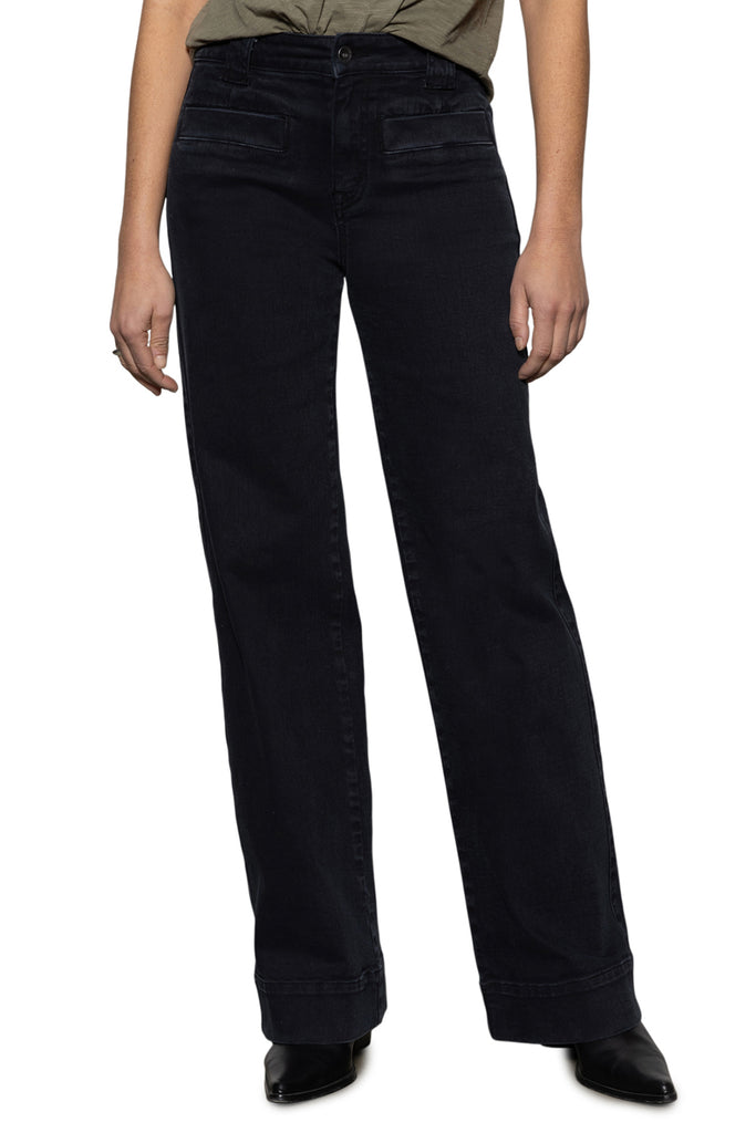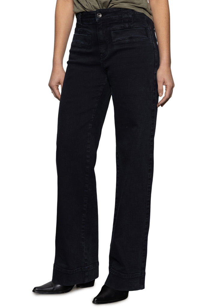 full length pants in versatile black. easy to wear pants have a mid-rise fit and feature two front welt pockets, back pockets, and a straight leg silhouette with a slightly flared ankle. pants are slightly stretchy, allowing for comfortable all day wear. pants can be dressed up or down for a variety of looks.