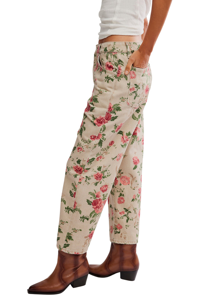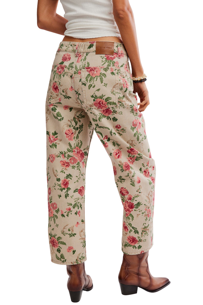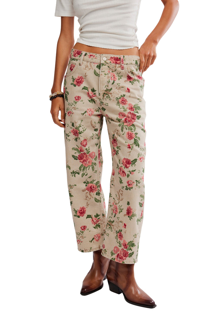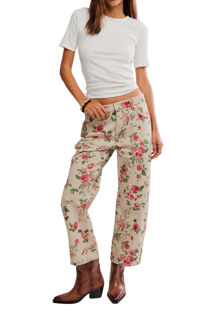 Personify Shopfree people perfectly printed pants in a sweet, vintage-inspired floral pattern. fun pants are made from an authentic rigid denim and have a low-rise, dropped barrel fit. pants feature a button-fly closure, five pocket design, and an ankle-length inseam. pair with a neutral tee or sweater for a unique look all fall long. jeans run true to size.