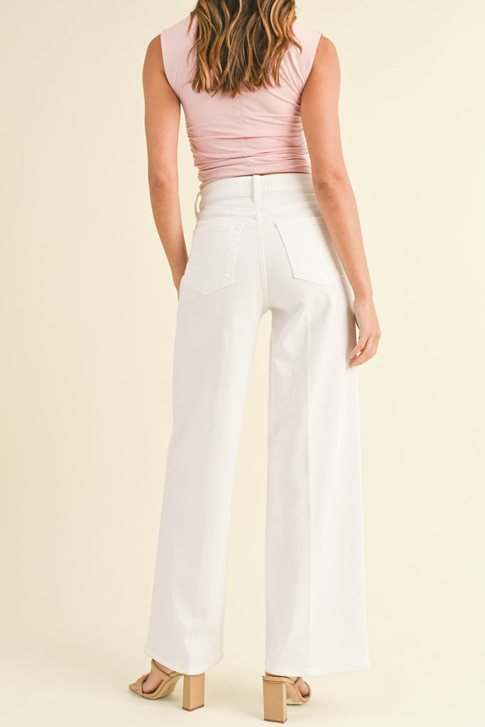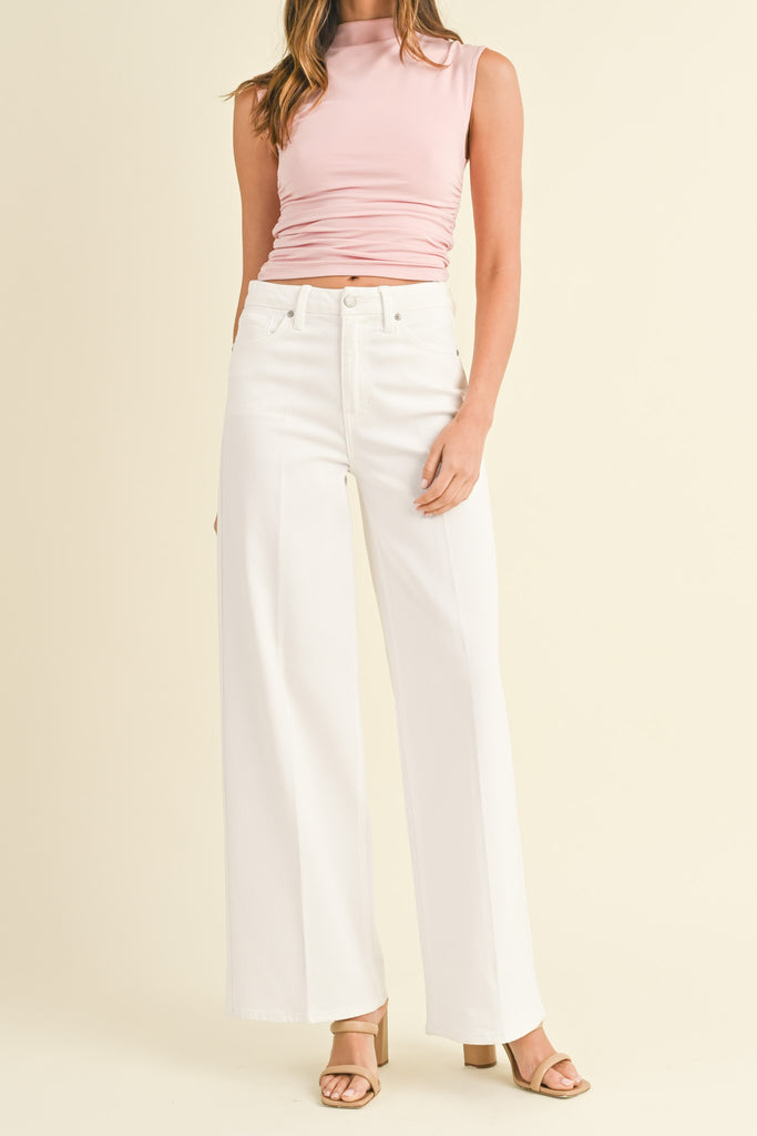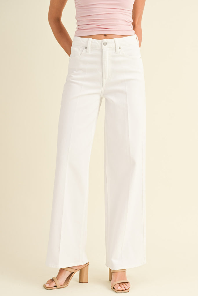 Personify Shopcute wide leg jeans in crisp white. full length jeans have a high-rise fit and a straight wide leg; jeans do not flare out. very comfortable and stretchy, these jeans have a modern-preppy vibe. versatile jeans can be worn and styled all summer long.