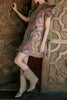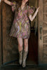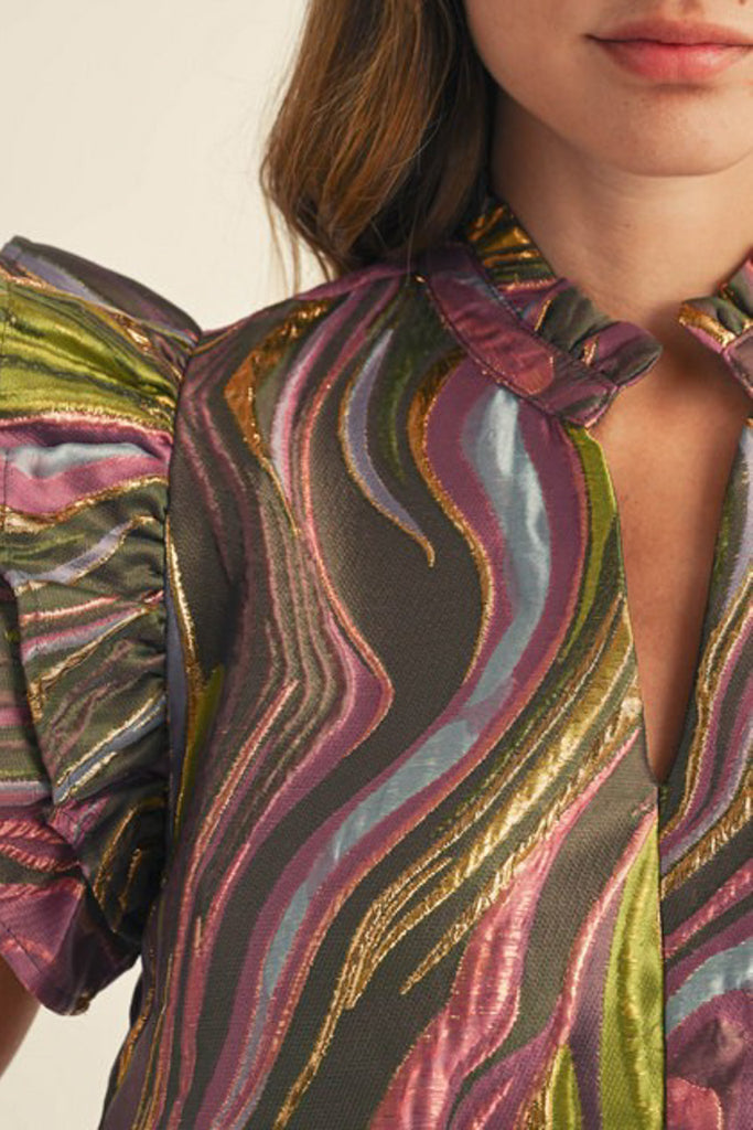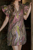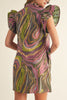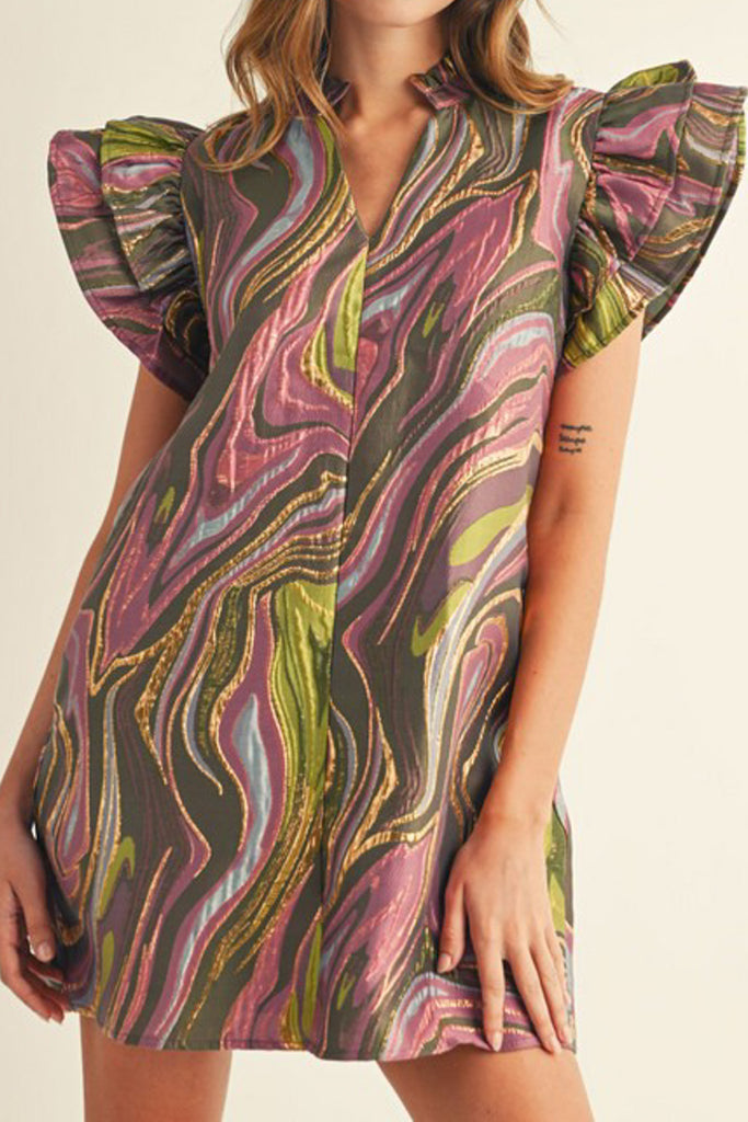 mini dress made from a gorgeous marbled material with metallic details. dress has an easy to wear shift shape and features a ruffled v neckline, statement-making flutter sleeves, and side pockets. special dress makes a unique piece to wear during the holidays or to a special event.