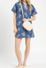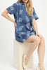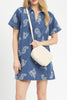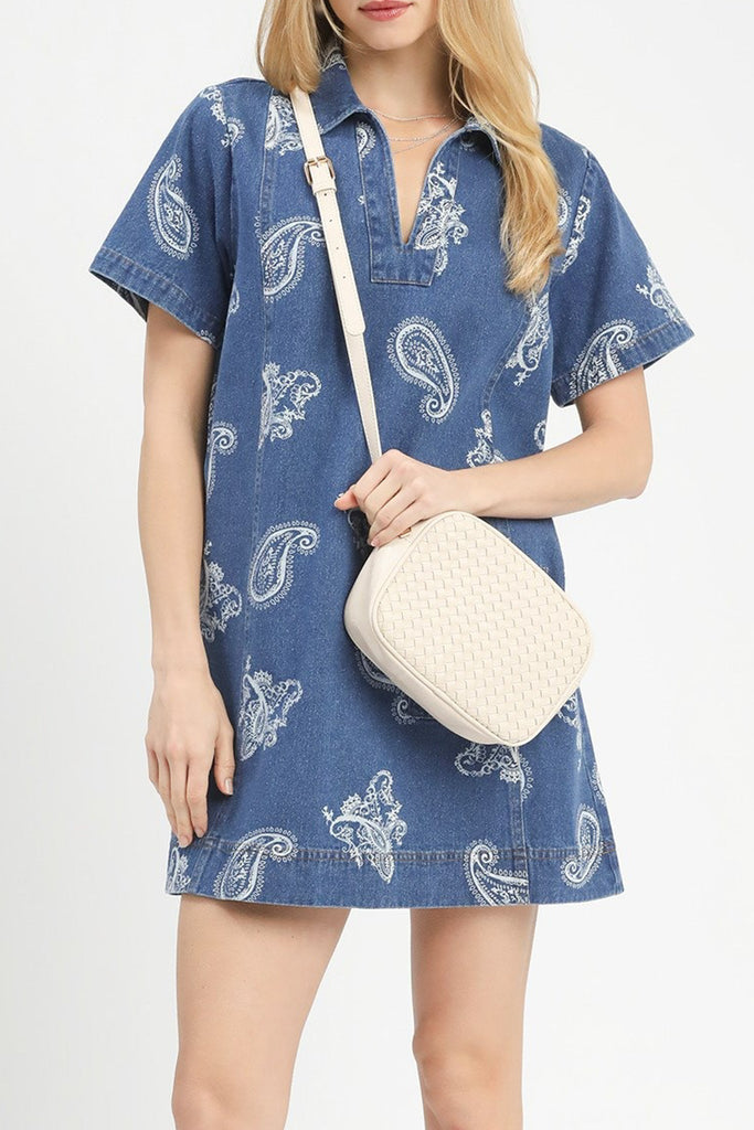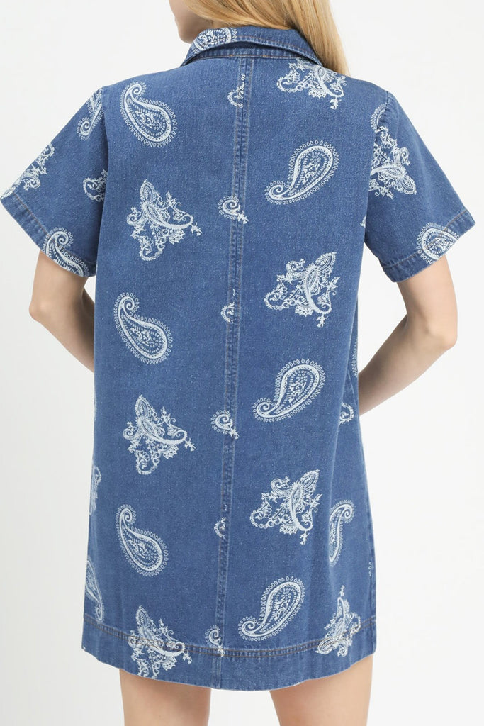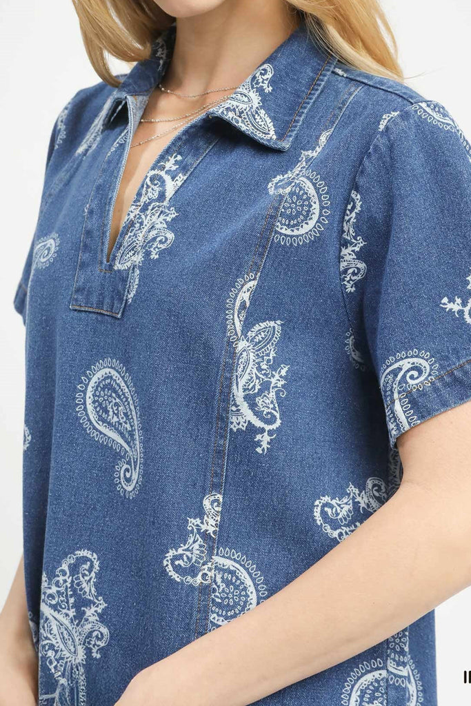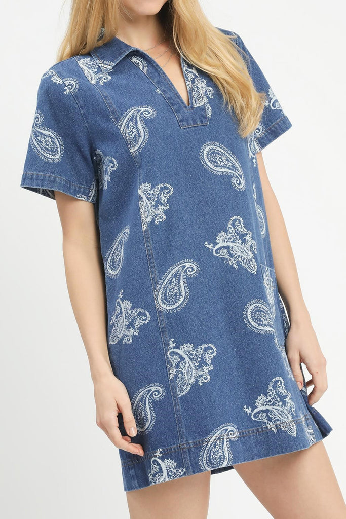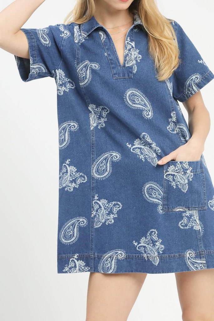cute shift dress in indigo blue denim with a western-inspired white paisley print. collared dress features a v neckline, front patch pocket, and a relaxed fit. easy to wear dress makes a great throw on and go piece for spring and summer.