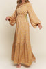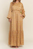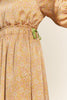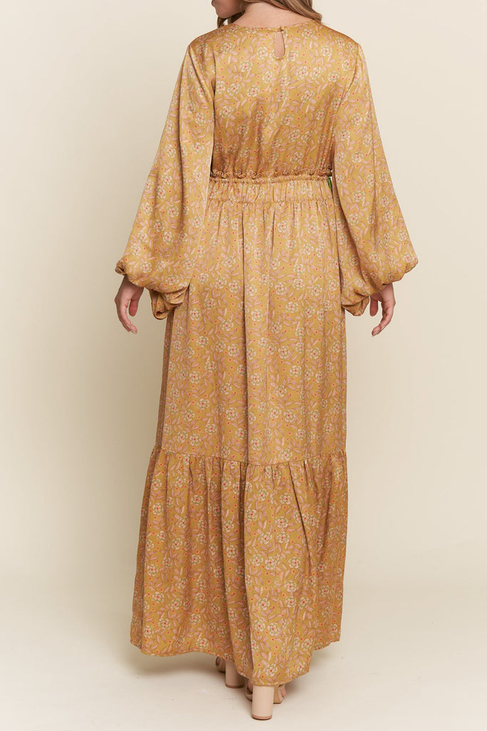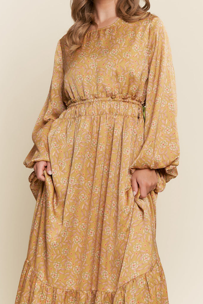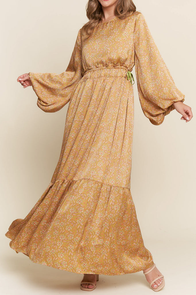 striking maxi dress in a golden-hued floral pattern. dress is made from a silky material and features a crew neckline with keyhole button closure on back, long balloon sleeves with elasticated cuffs, a gathered waist with adjustable bright green tie, side pockets, and a flowy maxi skirt with a wide ruffled bottom hem. dress is an easy to wear option for special events like fall weddings or family pictures.