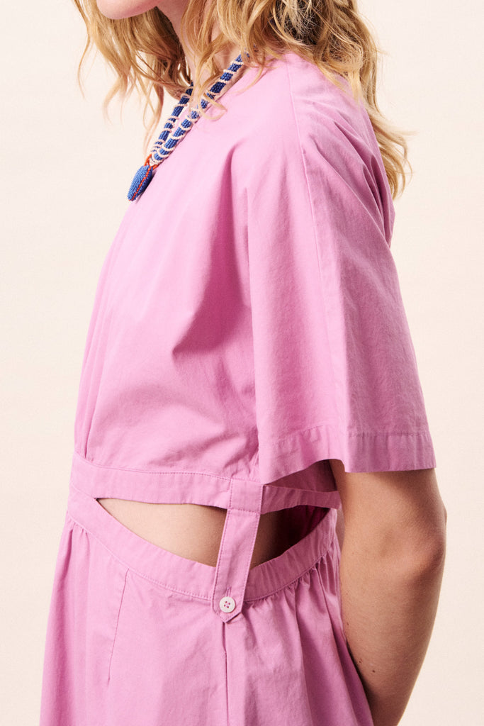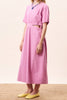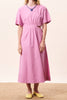 Personify Shopsimple, yet elevated midi dress in pretty purple-pink. lightweight cotton dress features a crew neckline, roomy short sleeves, gathered waist, side pockets, and a special asymmetrical cut-out with button detail on side. dress zips up the side for a great fit. comfortable dress is easy to wear and can be dressed up or down for different occasions this spring.