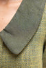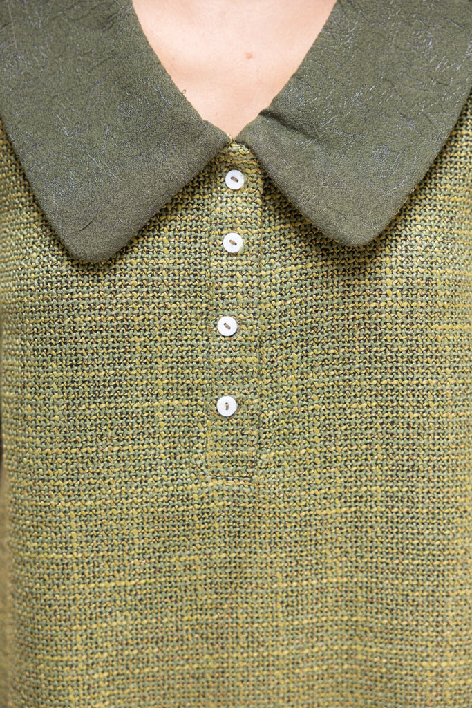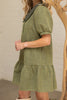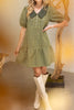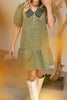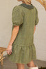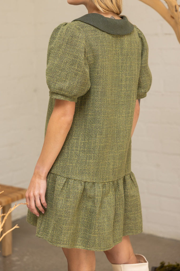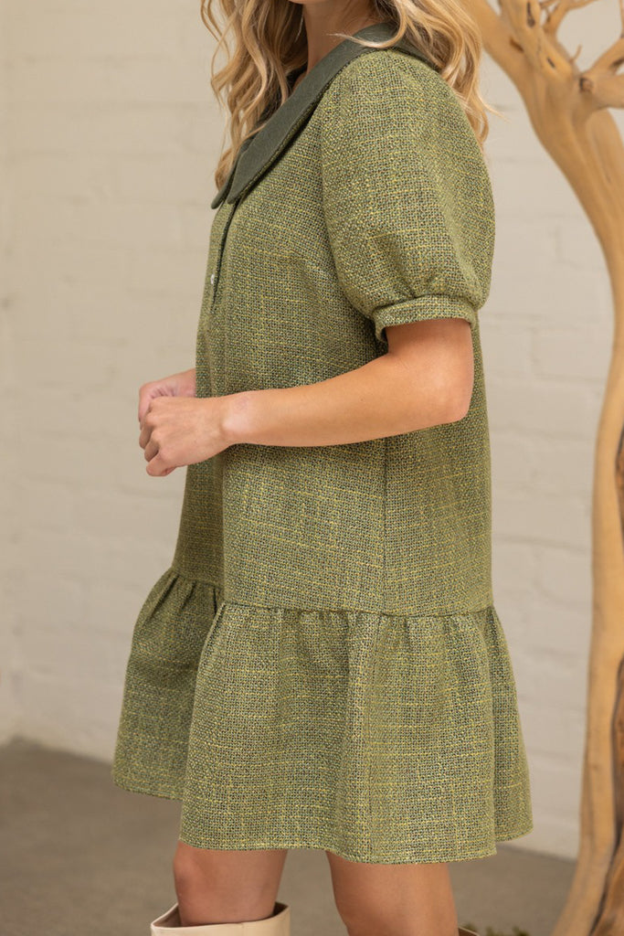 Personify Shopsweet mini dress in olive green with a hunter green collar. dress is made from a two tone green tweed, and collar has some metallic details. dress features a v neckline, statement collar, shimmery button details, short puff sleeves, and a ruffled dropped waist mini skirt. dress makes a wonderful option for fall and holiday events. note: dress runs a little small, and the fabric does not stretch.