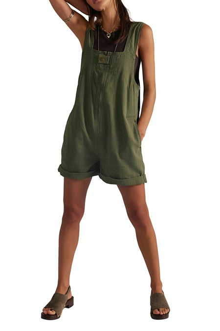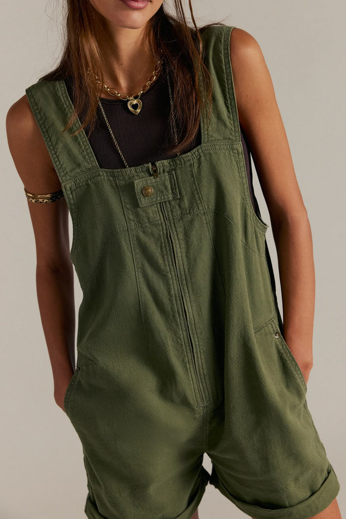 Personify Shopfree people one and done shortall in army green. shortalls are made from a rigid canvas material and have a shapeless, slouchy silhouette with a classic pinafore inspired design. shortalls feature a square neckline on front, deep v neckline on back, front zip closure with offset button tab, and a four pocket design. pair with a tank or tee for easy outfitting.