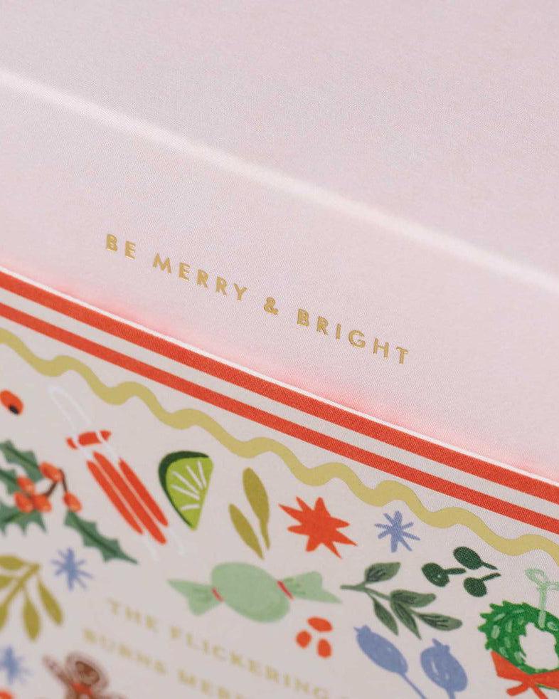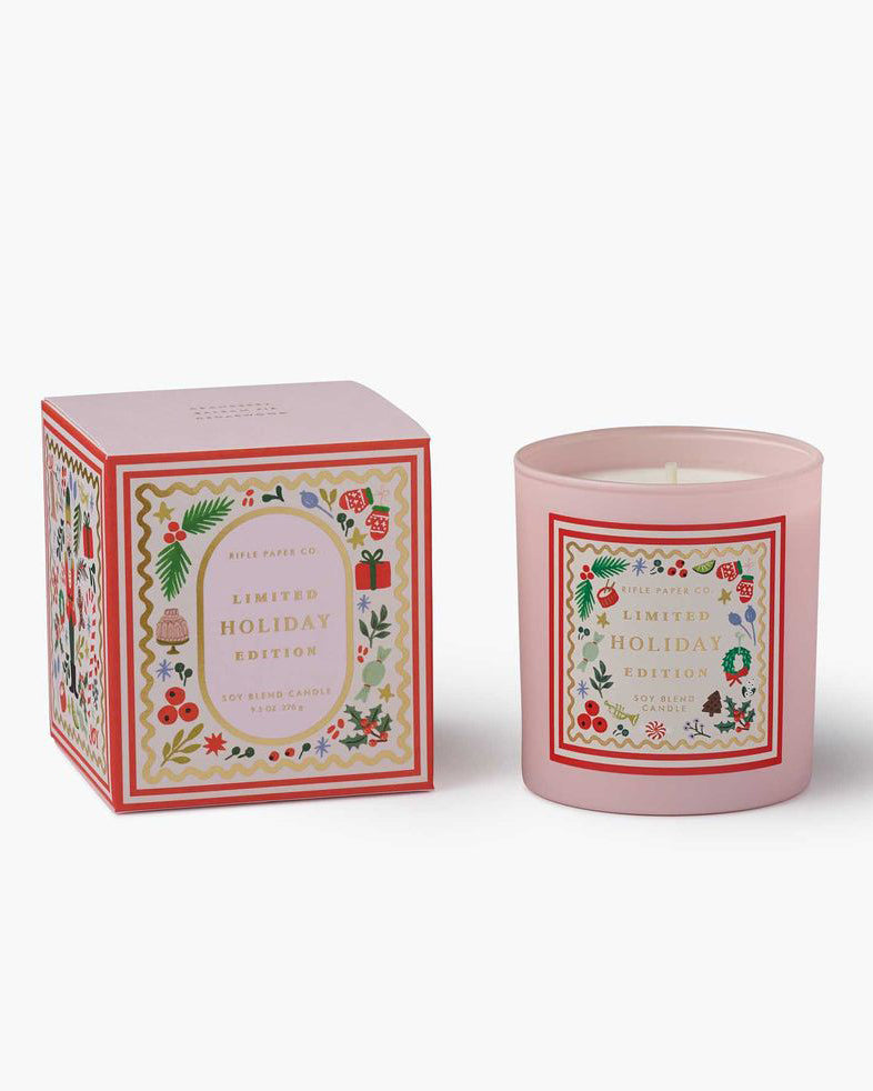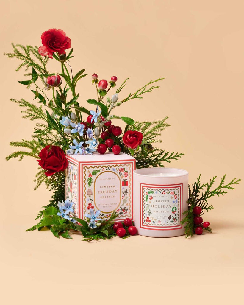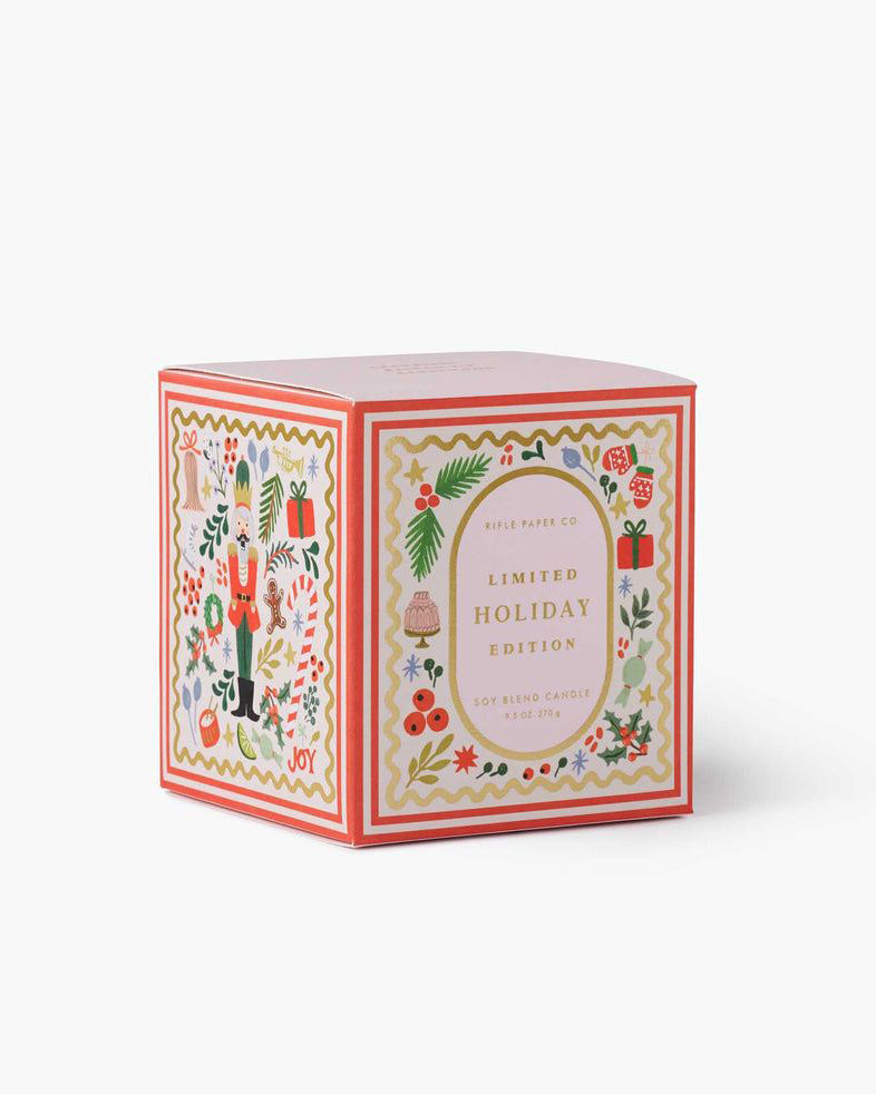 Personify Shopnotes of cranberry, balsam fir, and cedarwood make up this cozy holiday scent. rifle paper co candle is packaged in a glitter-accented box dancing with illustrations from the nutcracker ballet.