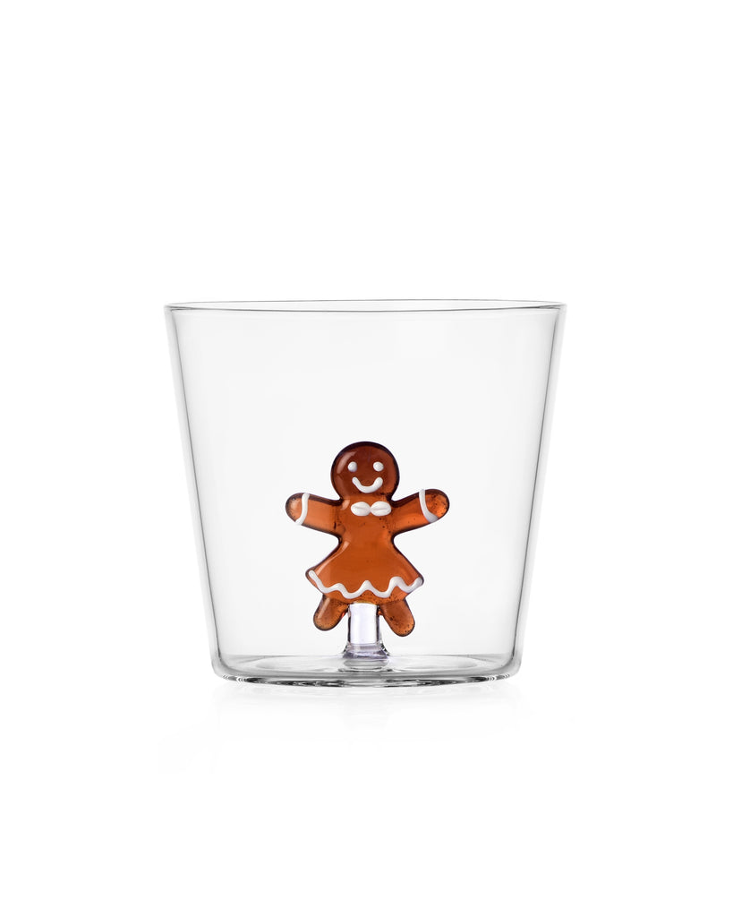 Personify Shopbeautifully made glass tumbler from ichendorf. glass tumbler features a sweet handmade gingerbread woman figurine inside. tumbler is designed by alessandra baldereschi.
