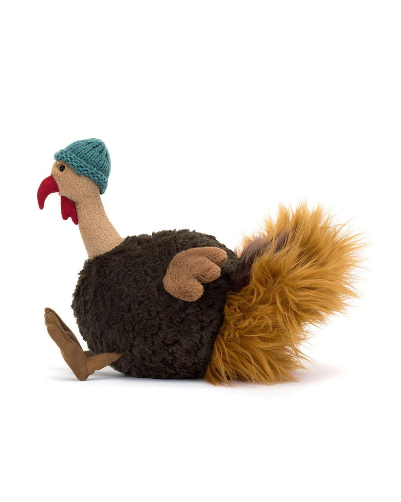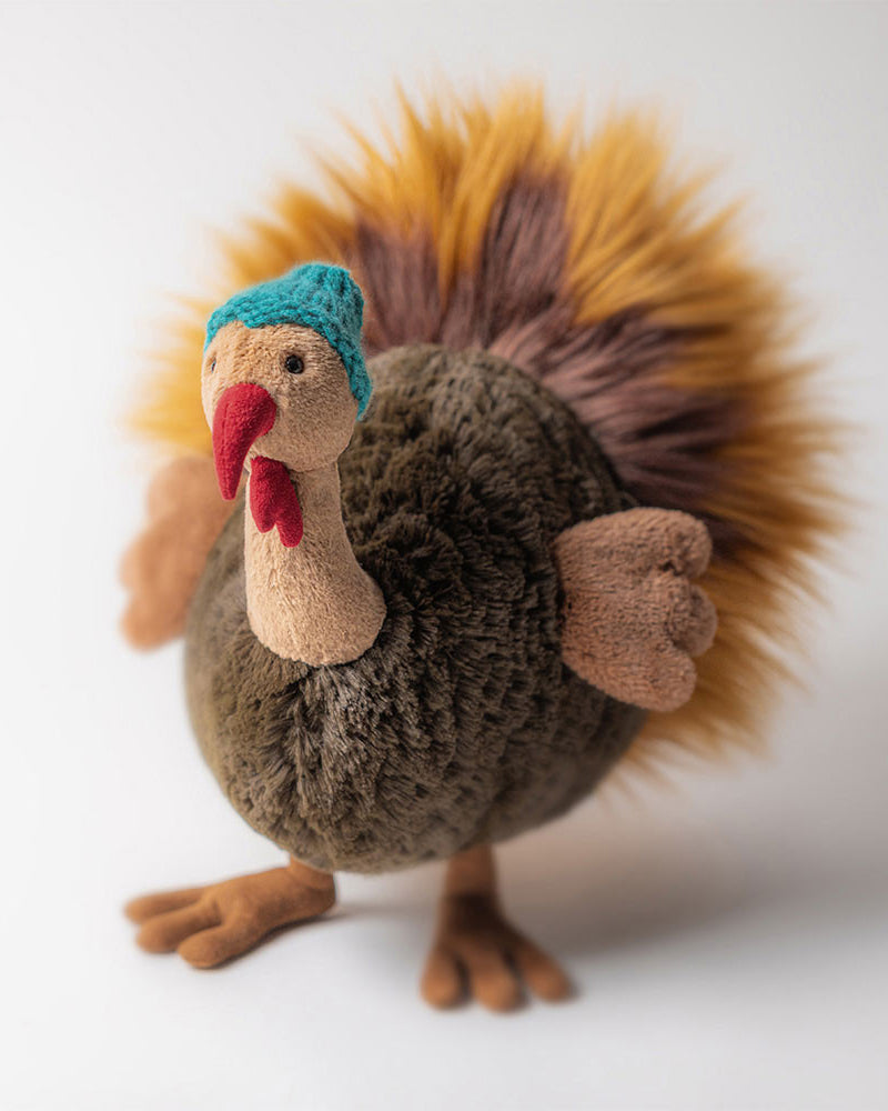 Personify Shoptheo turkey may have plumage, but this turkey's taking no chances. he's knitted himself a bold teal hat, ready for the winter! theo has oversized honey feet, a round cocoa tummy, and a silky ginger tail. most impressive of all, this proud turkey has a beautiful suedette caruncle (that's the wobbly bit under his beak). a dazzling gift for happy holidays. limit two per customer.