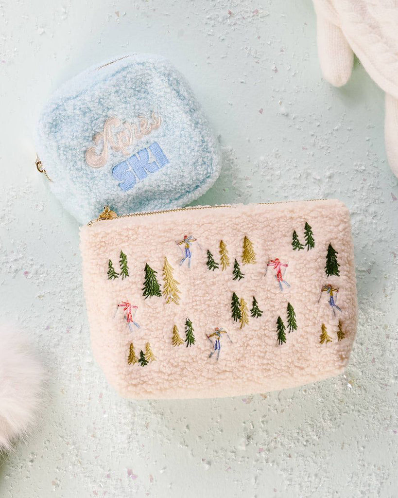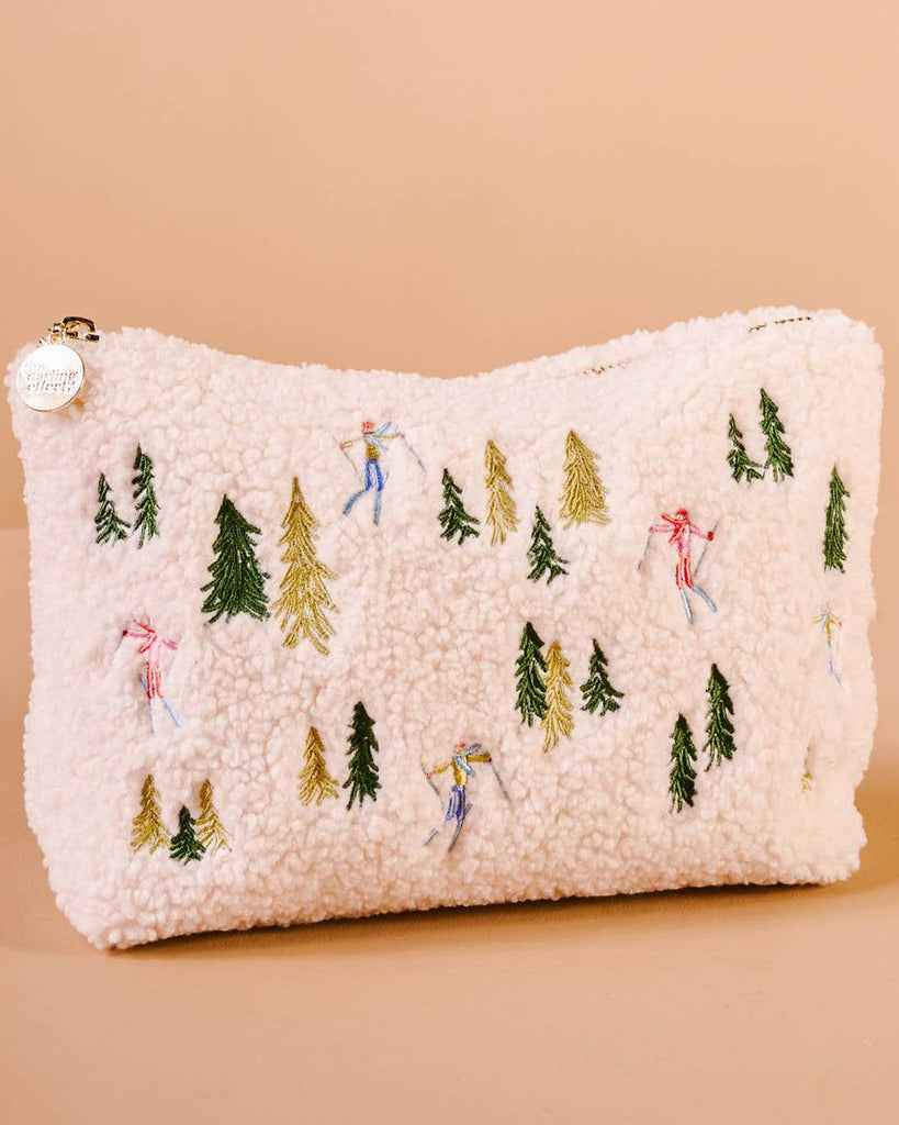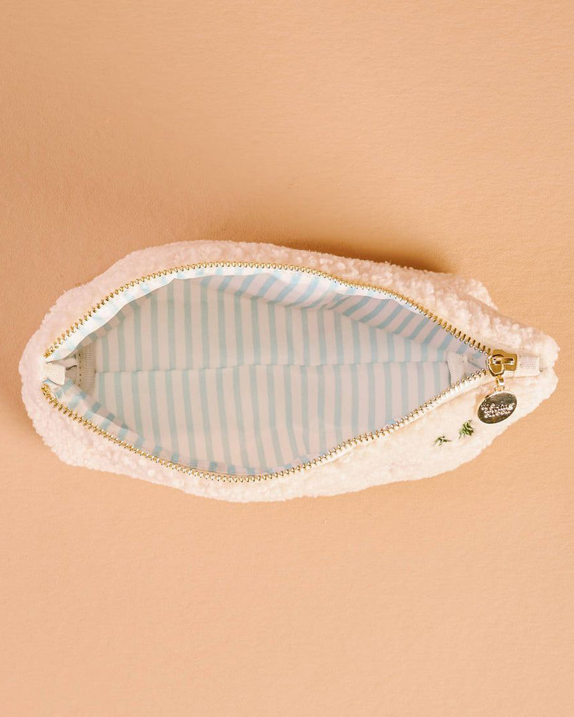 Personify Shopstay merry and organized from the ski lodge to the coffee run with this cute teddy pouch. made from soft, cozy sherpa and finished with gold zipper details, pouch brings slopes-side charm to your everyday essentials. cream-colored pouch features an embroidered design and a wipeable printed lining. it makes a thoughtful gift!