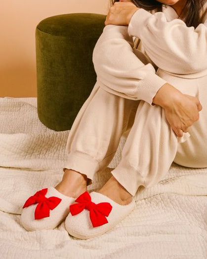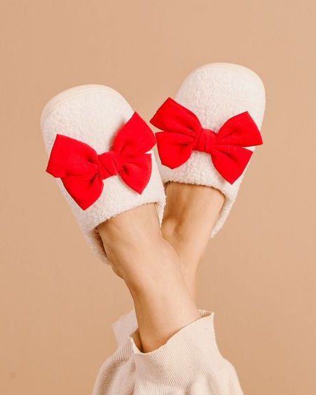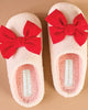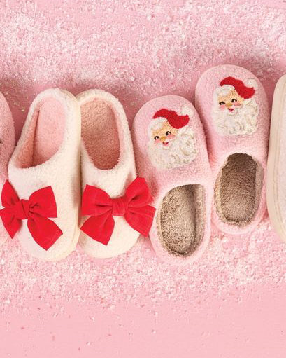 Personify Shopstay cozy this holiday with these sweet pink fuzzy slippers featuring a bold red bow! slipper's lightweight and fuzzy material will keep you feeling warm and comfortable, while its hard sole is perfect for light outdoor use. slippers make a perfect gift for yourself or a loved one! slippers are available in two sizes.