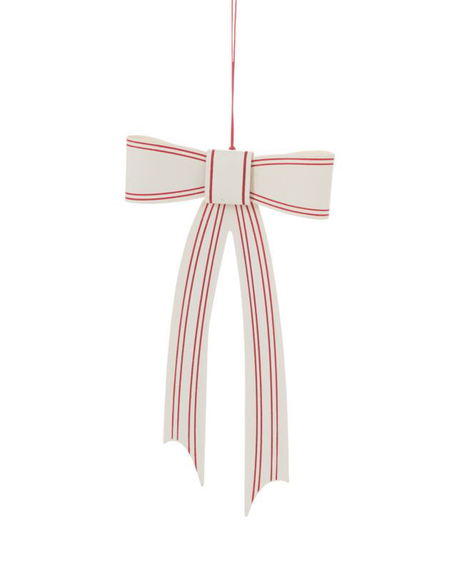 Personify Shopdarling metal bow ornament in white with red stripes. classic bow is perfectly tied with dimensional loops, a square center, and a bold red string for hanging, and dimensional loops with a square center. quintessentially christmas bow can be used on the tree as an ornament or as an oversized option for holiday gift wrapping.